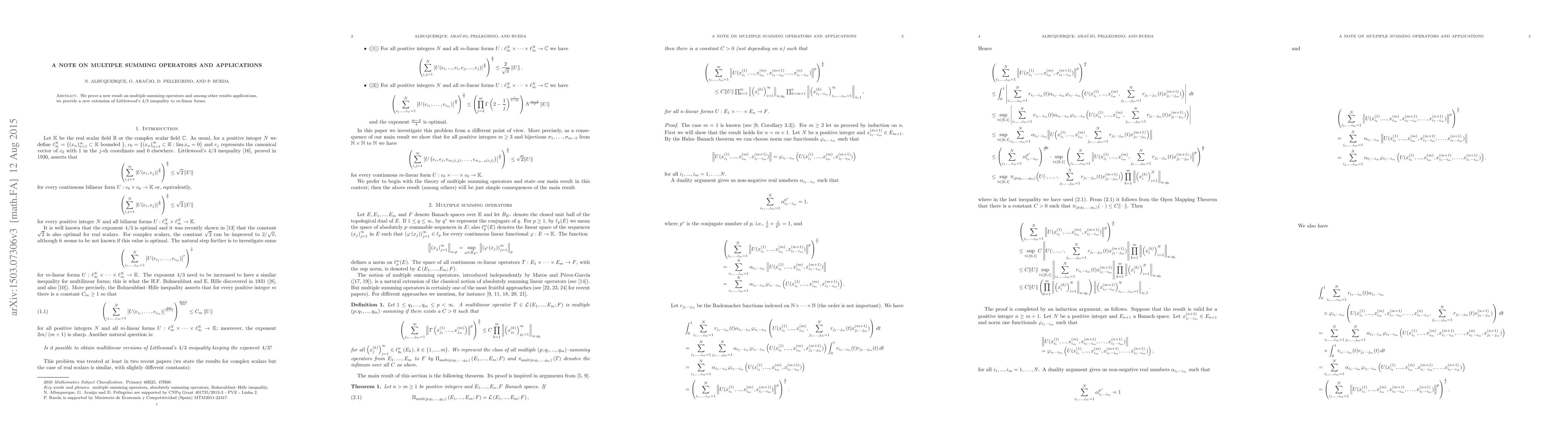 This paper proves a new result on multiple summing operators with applications to Littlewood's 4/3 inequality for m-linear forms.