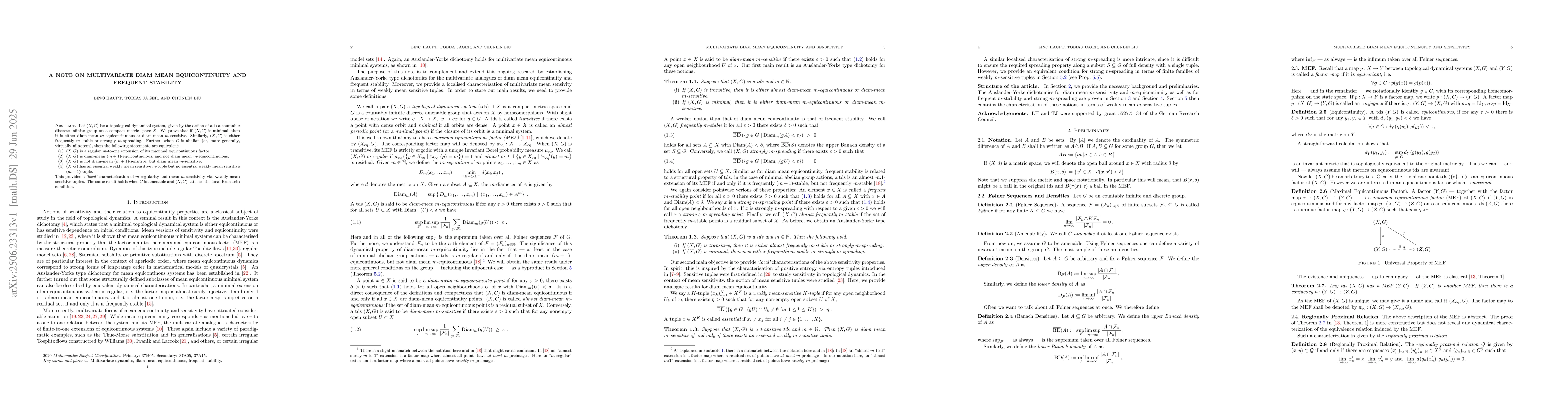 Let $(X,G)$ be a topological dynamical system, given by the action of a is a countable discrete infinite group on a compact metric space $X$. We prove that if $(X,G)$ is minimal, then it is either diam-mean $m$-equicontinuious or diam-mean $m$-sensitive. Similarly, $(X,G)$ is either frequently $m$-stable or strongly $m$-spreading. Further, when $G$ is abelian (or, more generally, virtually nilpotent), then the following statements are equivalent: $\bullet$ $(X,G)$ is a regular $m$-to-one extension of its maximal equicontinuous factor; $\bullet$ $(X,G)$ is diam-mean $(m+1)$-equicontinuious, and not diam mean $m$-equicontinuious; $\bullet$ $(X,G)$ is not diam-mean $(m+1)$-sensitive, but diam mean $m$-sensitive; $\bullet$ $(X,G)$ has an essential weakly mean sensitive $m$-tuple but no essential weakly mean sensitive $(m+1)$-tuple. This provides a {\em \enquote*{local}} characterisation of $m$-regularity and mean $m$-sensitivity vial weakly mean sensitive tuples. The same result holds when $G$ is amenable and $(X,G)$ satisfies the local Bronstein condition.