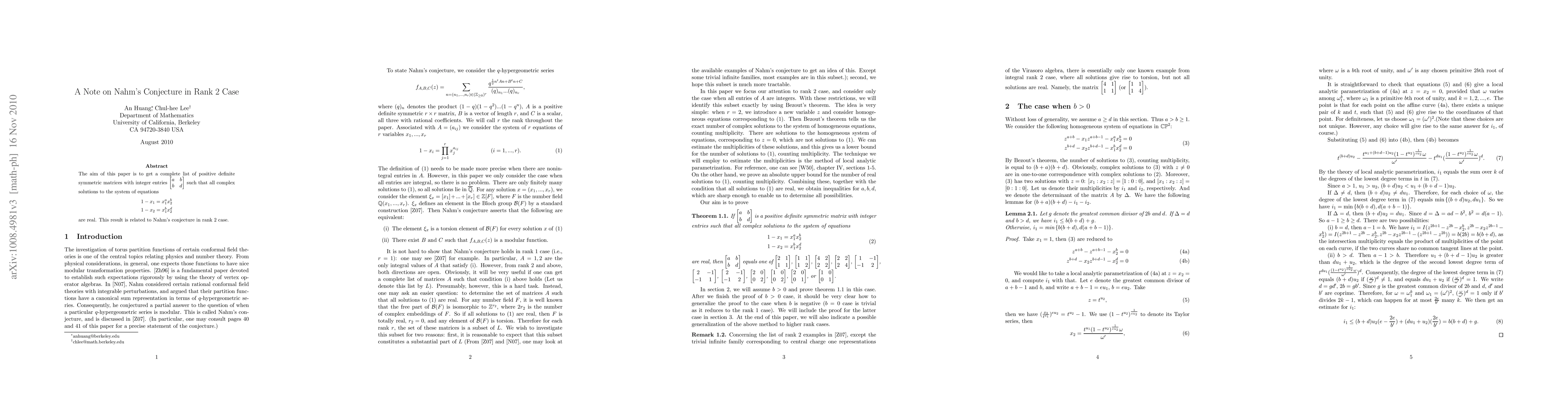 The aim of this paper is to get a complete list of positive definite symmetric matrices with integer entries $\a&b\b&d\$ such that all complex solutions to the system of equations $1-x_1=x_1^ax_2^b\ 1-x_2=x_1^bx_2^d$ are real. This result is related to Nahm's conjecture in rank 2 case.