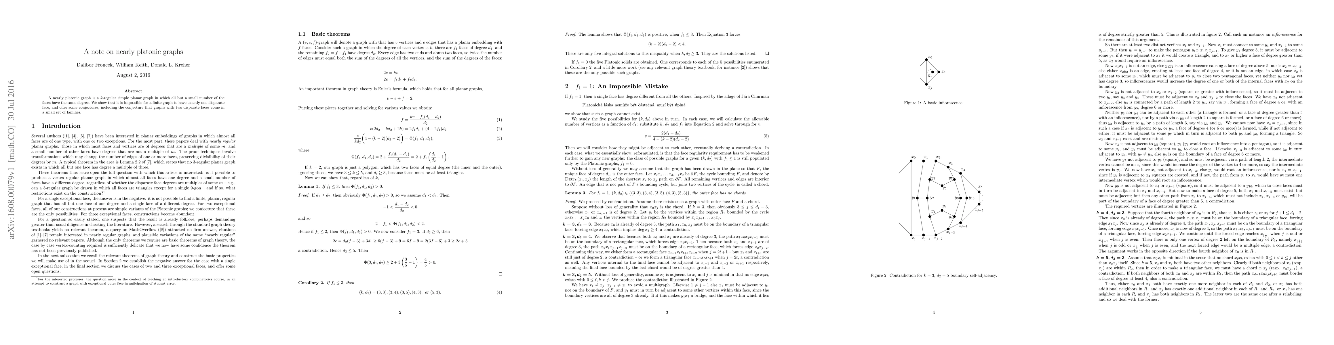 Summary: This paper explores nearly platonic graphs, demonstrating that a finite k-regular planar graph cannot have exactly one disparate face, and proposes that graphs with two disparate faces belong to a limited set of families.