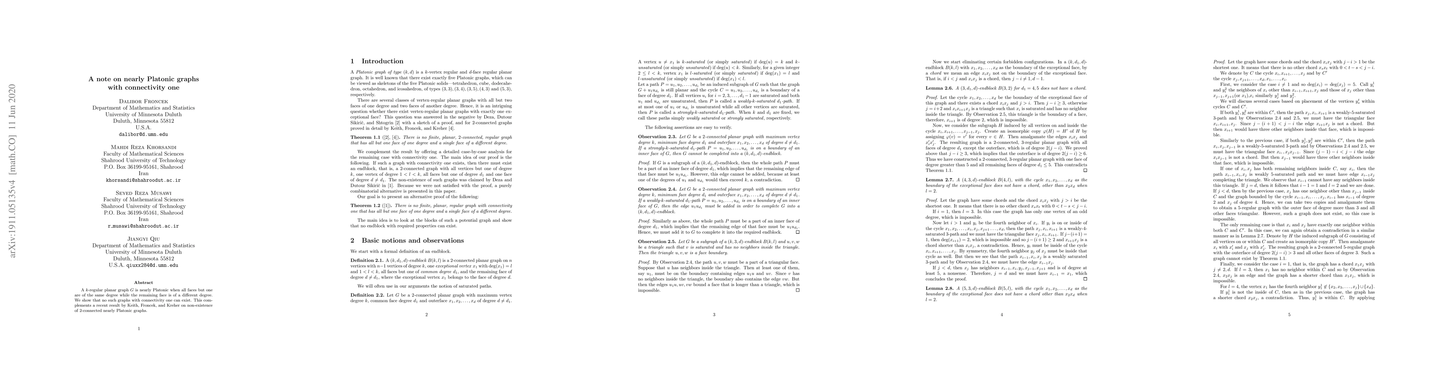 Summary: The paper proves that no k-regular planar graph with connectivity one can be nearly Platonic, where all but one face have the same degree while the remaining face has a different degree. This result extends the non-existence of 2-connected nearly Platonic graphs established by Keith, Froncek, and Kreher.