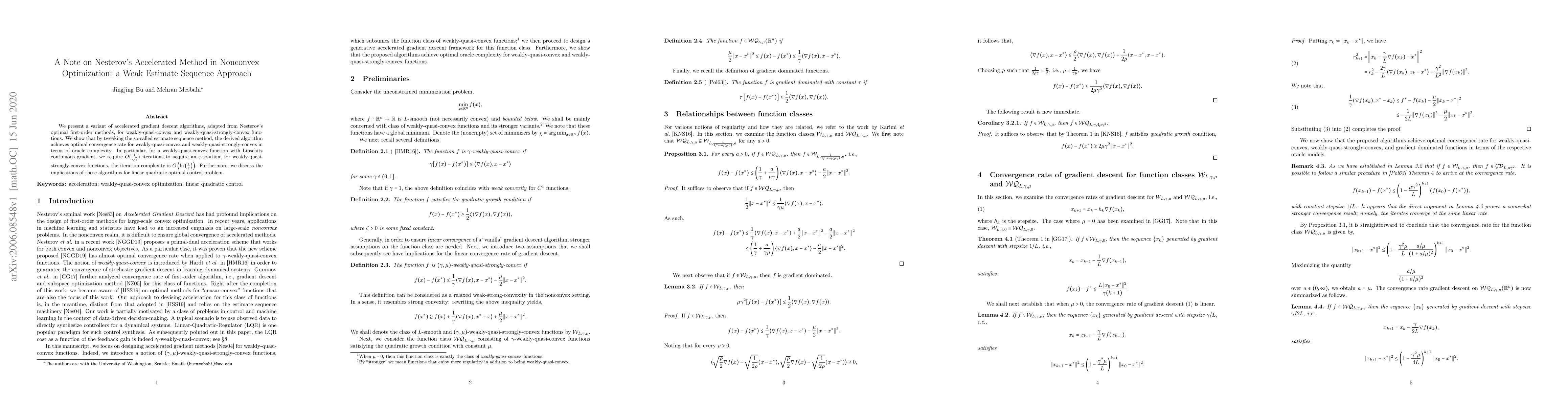 We present a variant of accelerated gradient descent algorithms, adapted from Nesterov's optimal first-order methods, for weakly-quasi-convex and weakly-quasi-strongly-convex functions. We show that by tweaking the so-called estimate sequence method, the derived algorithm achieves optimal convergence rate for weakly-quasi-convex and weakly-quasi-strongly-convex in terms of oracle complexity. In particular, for a weakly-quasi-convex function with Lipschitz continuous gradient, we require $O(\frac{1}{\sqrt{\varepsilon}})$ iterations to acquire an $\varepsilon$-solution; for weakly-quasi-strongly-convex functions, the iteration complexity is $O\left( \ln\left(\frac{1}{\varepsilon}\right) \right)$. Furthermore, we discuss the implications of these algorithms for linear quadratic optimal control problem.