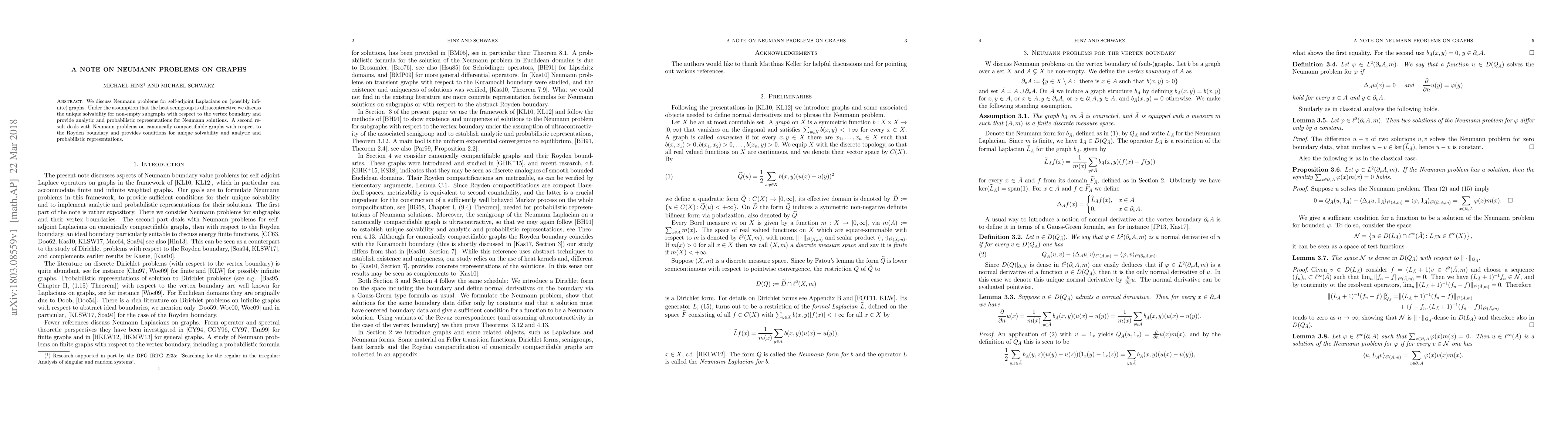 We discuss Neumann problems for self-adjoint Laplacians on (possibly infinite) graphs. Under the assumption that the heat semigroup is ultracontractive we discuss the unique solvability for non-empty subgraphs with respect to the vertex boundary and provide analytic and probabilistic representations for Neumann solutions. A second result deals with Neumann problems on canonically compactifiable graphs with respect to the Royden boundary and provides conditions for unique solvability and analytic and probabilistic representations.