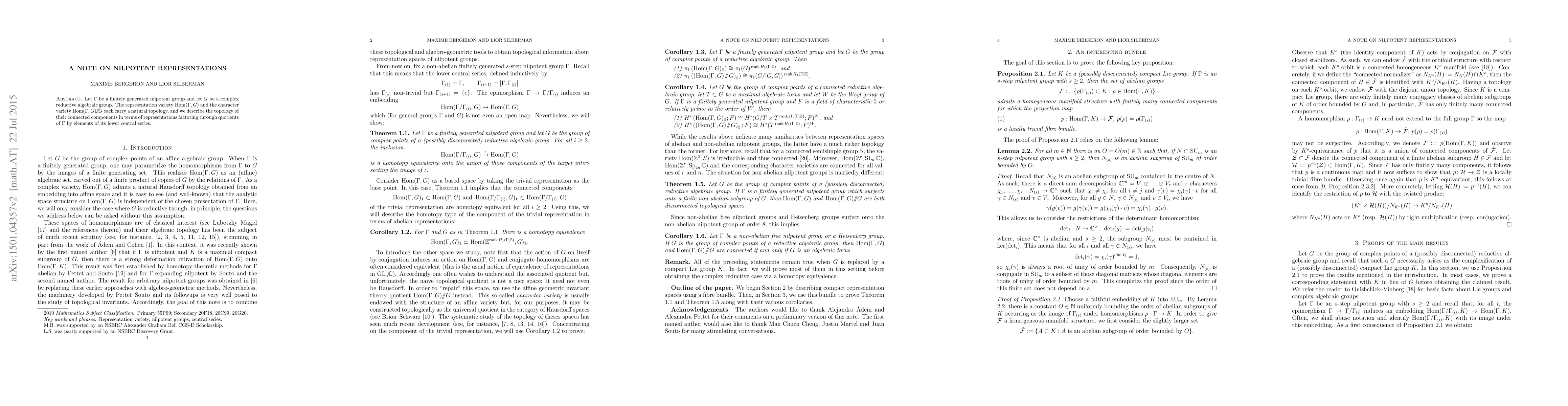 Let $\Gamma$ be a finitely generated nilpotent group and let G be a complex reductive algebraic group. The representation variety $\mathrm{Hom}(\Gamma,G)$ and the character variety $\mathrm{Hom}(\Gamma,G)//G$ each carry a natural topology, and we describe the topology of their connected components in terms of representations factoring through quotients of $\Gamma$ by elements of its lower central series.