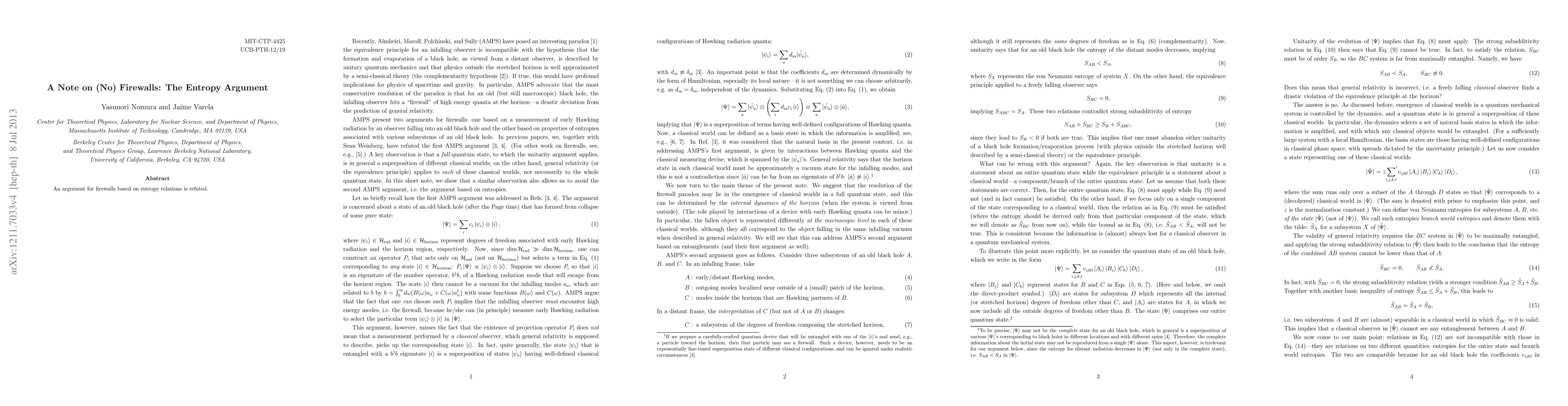 Summary: This paper refutes the entropy-based argument for the existence of firewalls in black hole physics, challenging the notion that entropy considerations necessitate a physical barrier at the event horizon.