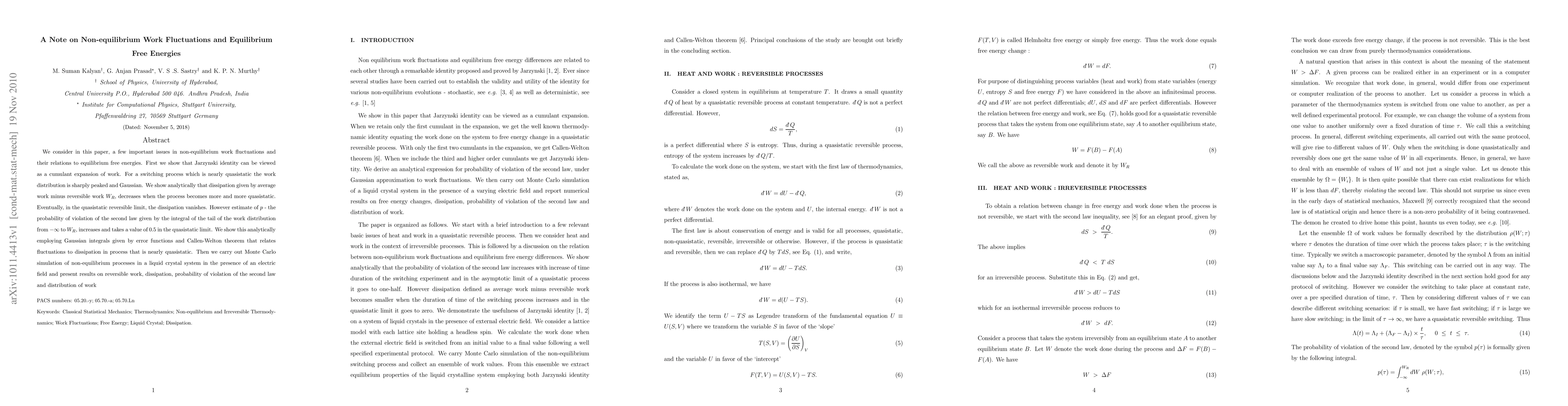 We consider in this paper, a few important issues in non-equilibrium work fluctuations and their relations to equilibrium free energies. First we show that Jarzynski identity can be viewed as a cumulant expansion of work. For a switching process which is nearly quasistatic the work distribution is sharply peaked and Gaussian. We show analytically that dissipation given by average work minus reversible work $W_R$, decreases when the process becomes more and more quasistatic. Eventually, in the quasistatic reversible limit, the dissipation vanishes. However estimate of $p$ - the probability of violation of the second law given by the integral of the tail of the work distribution from $-\infty$ to $W_R$, increases and takes a value of $0.5$ in the quasistatic limit. We show this analytically employing Gaussian integrals given by error functions and Callen-Welton theorem that relates fluctuations to dissipation in process that is nearly quasistatic. Then we carry out Monte Carlo simulation of non-equilibrium processes in a liquid crystal system in the presence of an electric field and present results on reversible work, dissipation, probability of violation of the second law and distribution of work