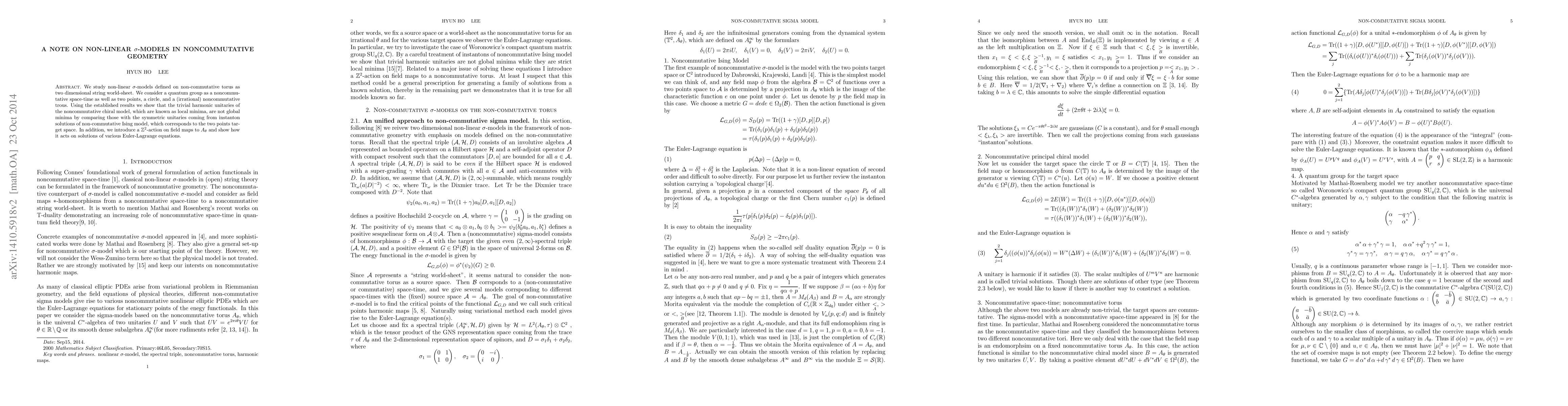 We study non-linear $\sigma$-models defined on noncommutative torus as a two dimensional string world-sheet. We consider a quantum group as a noncommutative space-time as well as two points, a circle, and a noncommutative torus. Using the establised results we show that the trivial harmonic unitaries of the noncommutative chiral model, which are known as local minima, are not global minima by comparing those with the symmetric unitaries coming from instanton solutions of noncommutative Ising model, which corresponds to the two points target space. In addition,we introduce a $\mathbb{Z}^2$-action on field maps to noncommutative torus and show how it acts on solutions of various Euler-Lagrange equations.