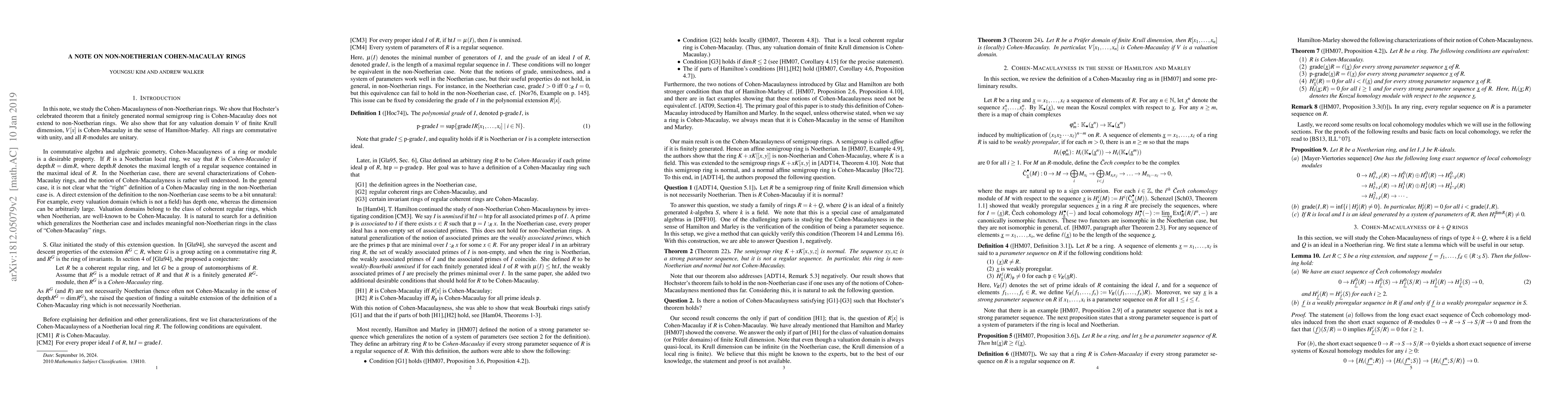 This note investigates the Cohen-Macaulay properties of non-Noetherian rings, revealing that Hochster's theorem does not apply to these rings. Additionally, it proves that for valuation domains $V$ of finite Krull dimension, $V[x]$ retains Cohen-Macaulay properties as defined by Hamilton-Marley.