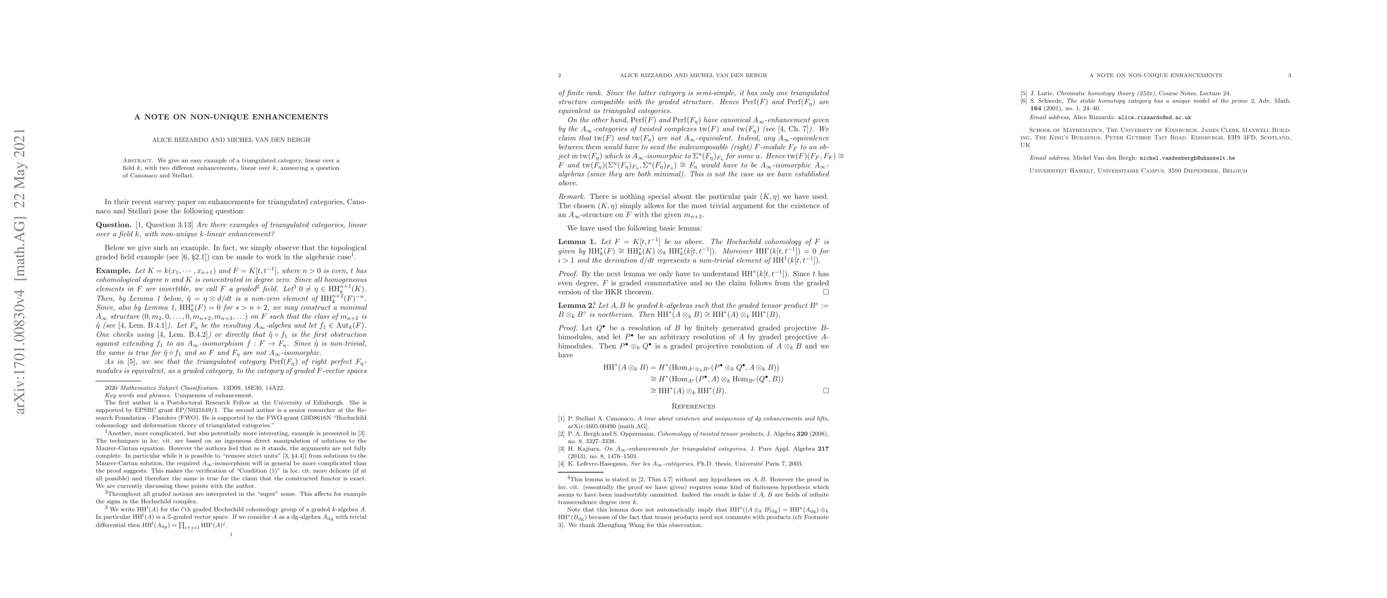 This paper provides a straightforward example of a triangulated category over a field $k$ that supports two distinct enhancements, resolving a question posed by Canonaco and Stellari. The findings demonstrate the existence of non-unique enhancements in certain triangulated categories.