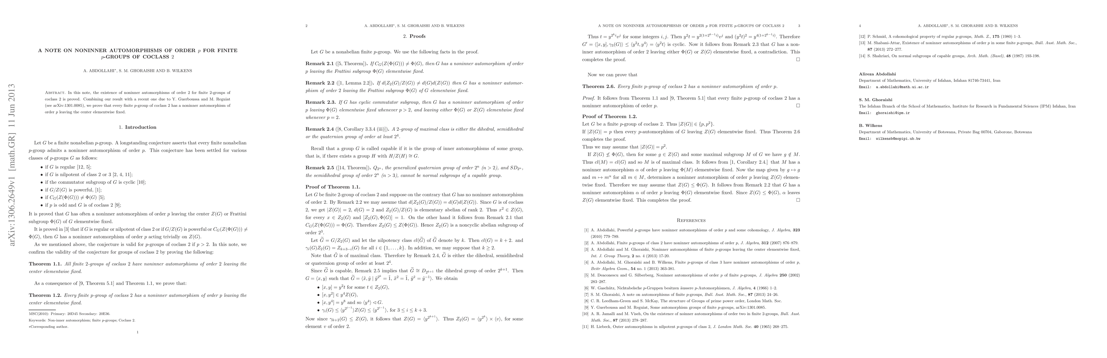 Summary: This paper proves the existence of noninner automorphisms of order 2 in finite 2-groups of coclass 2 and, by combining this with a related result, shows that every finite $p$-group of coclass 2 has a noninner automorphism of order $p$ fixing the center elementwise.