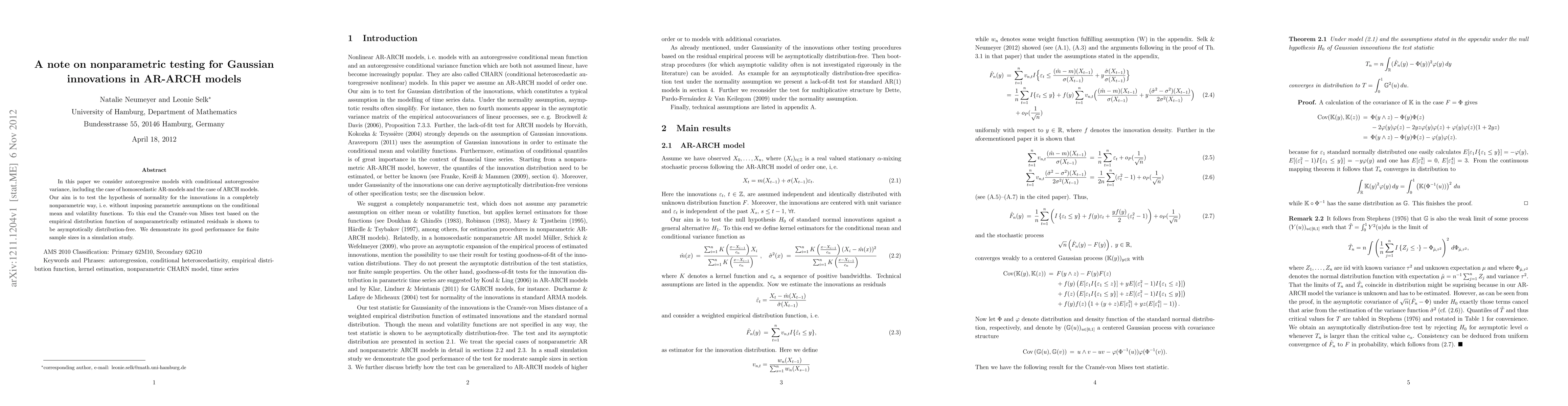 This paper proposes a nonparametric test for assessing the normality of innovations in autoregressive and ARCH models, using the Cramér-von Mises test on empirical distribution functions of nonparametrically estimated residuals. The method is shown to be asymptotically distribution-free and performs well in finite samples, as demonstrated by a simulation study.