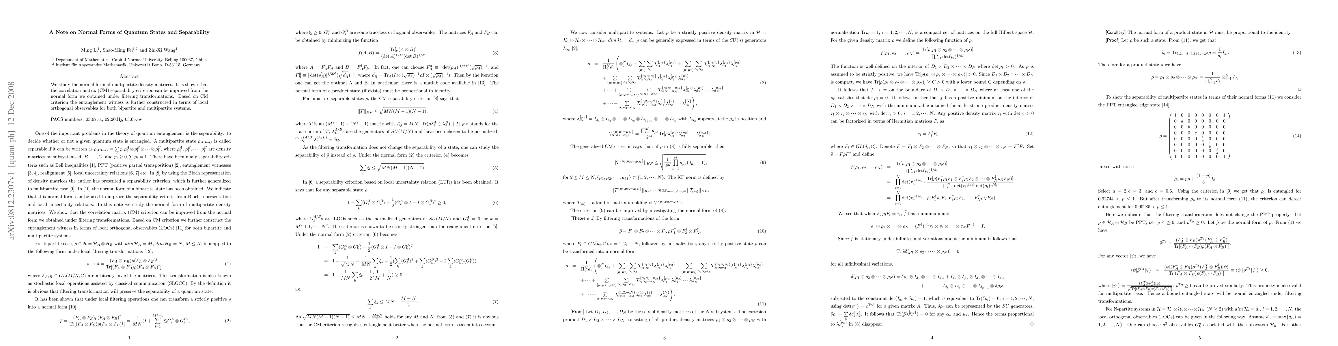 We study the normal form of multipartite density matrices. It is shown that the correlation matrix (CM) separability criterion can be improved from the normal form we obtained under filtering transformations. Based on CM criterion the entanglement witness is further constructed in terms of local orthogonal observables for both bipartite and multipartite systems.