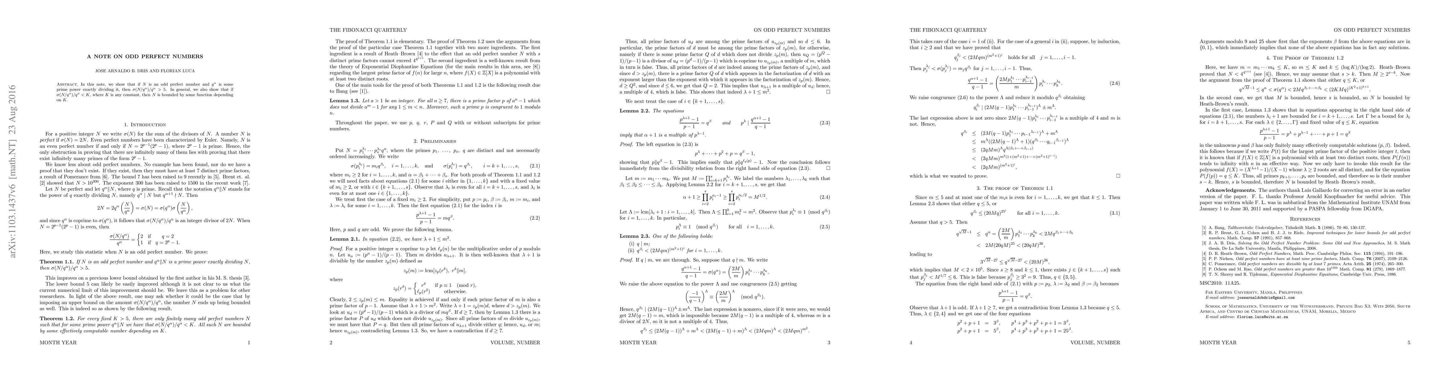 The paper presents new theoretical results on the ratio σ(N/q^α)/q^α for odd perfect numbers N, linking it to bounds on N's magnitude.