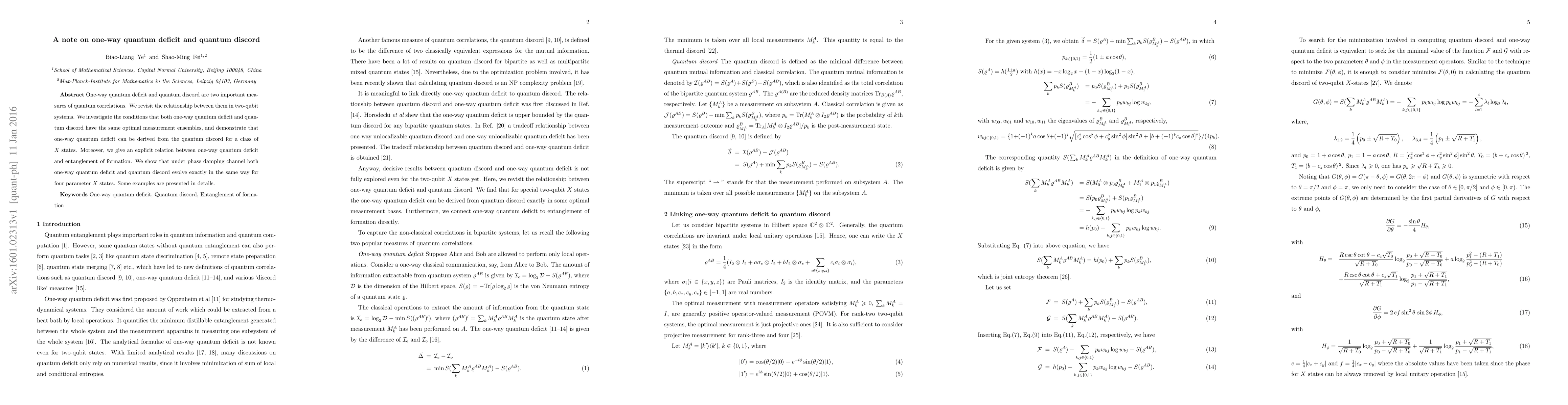This paper explores the relationship between one-way quantum deficit and quantum discord in two-qubit systems, showing that they can be derived from each other under certain conditions and that they evolve identically under phase damping for specific X states. It also provides an explicit relation between one-way quantum deficit and entanglement of formation.