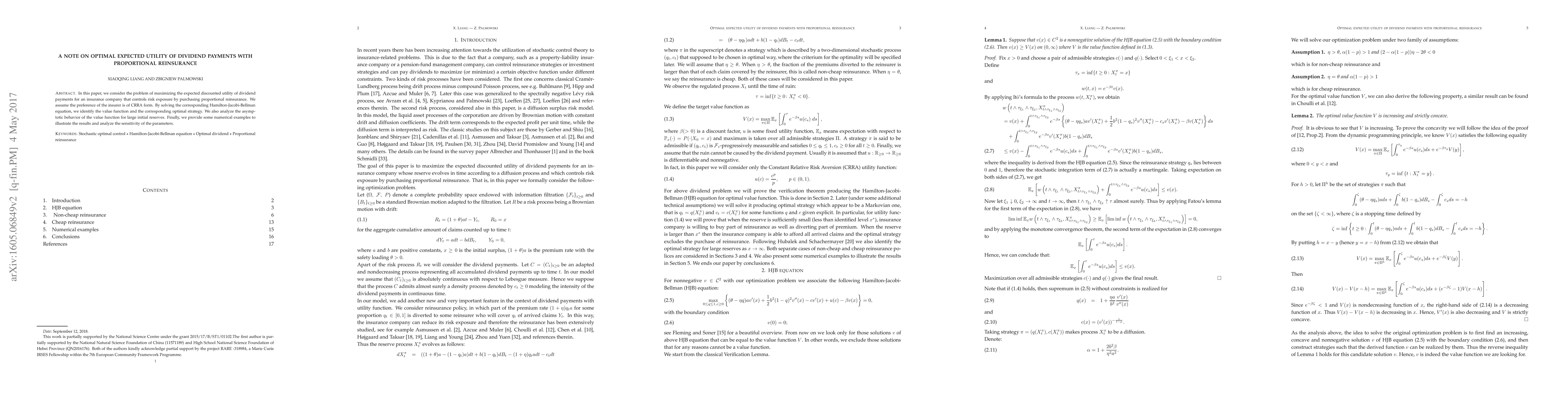 This paper maximizes the expected discounted utility of dividend payments for an insurance company using proportional reinsurance, assuming CRRA preferences. It identifies the optimal strategy via the Hamilton-Jacobi-Bellman equation and analyzes the asymptotic behavior of the value function for large initial reserves.