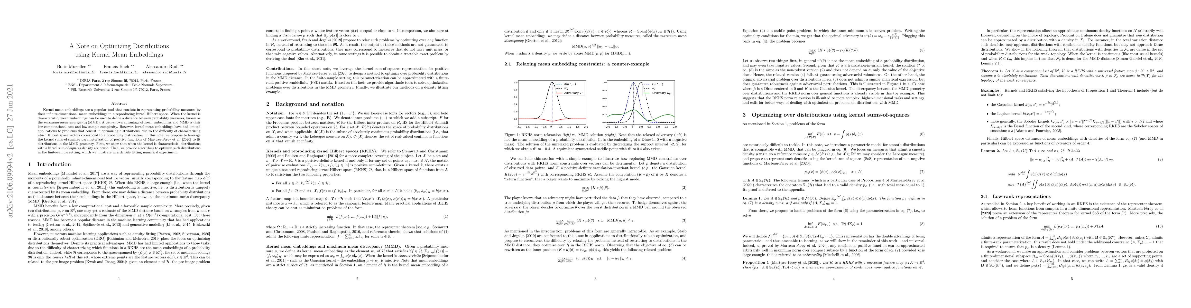 Kernel mean embeddings are a popular tool that consists in representing probability measures by their infinite-dimensional mean embeddings in a reproducing kernel Hilbert space. When the kernel is characteristic, mean embeddings can be used to define a distance between probability measures, known as the maximum mean discrepancy (MMD). A well-known advantage of mean embeddings and MMD is their low computational cost and low sample complexity. However, kernel mean embeddings have had limited applications to problems that consist in optimizing distributions, due to the difficulty of characterizing which Hilbert space vectors correspond to a probability distribution. In this note, we propose to leverage the kernel sums-of-squares parameterization of positive functions of Marteau-Ferey et al. [2020] to fit distributions in the MMD geometry. First, we show that when the kernel is characteristic, distributions with a kernel sum-of-squares density are dense. Then, we provide algorithms to optimize such distributions in the finite-sample setting, which we illustrate in a density fitting numerical experiment.