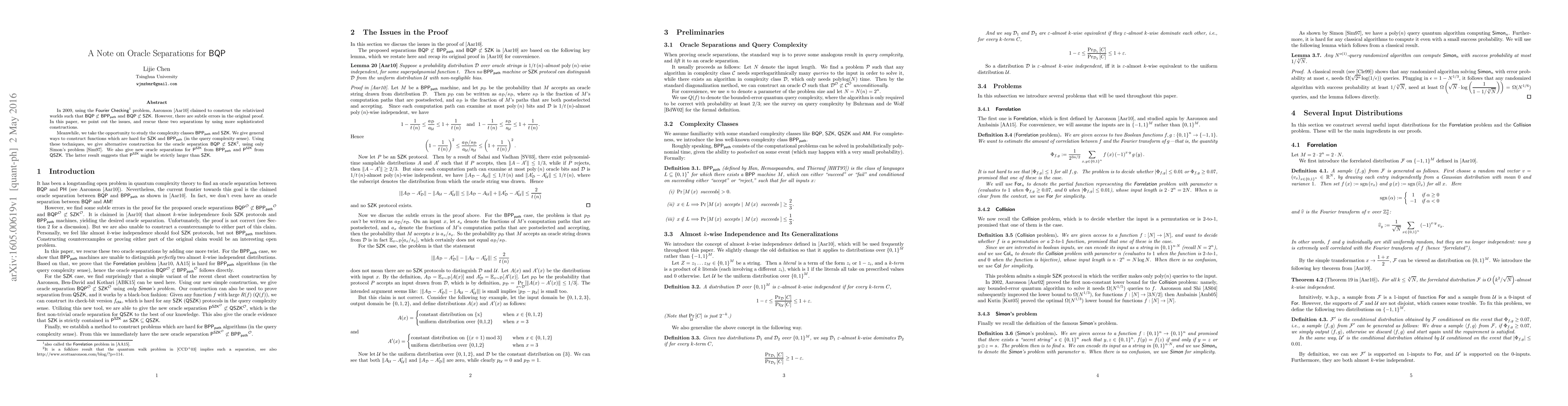 The paper corrects errors in Aaronson's 2009 proof regarding oracle separations for BQP, using more sophisticated constructions and general ways to create functions hard for SZK and BPP_path.