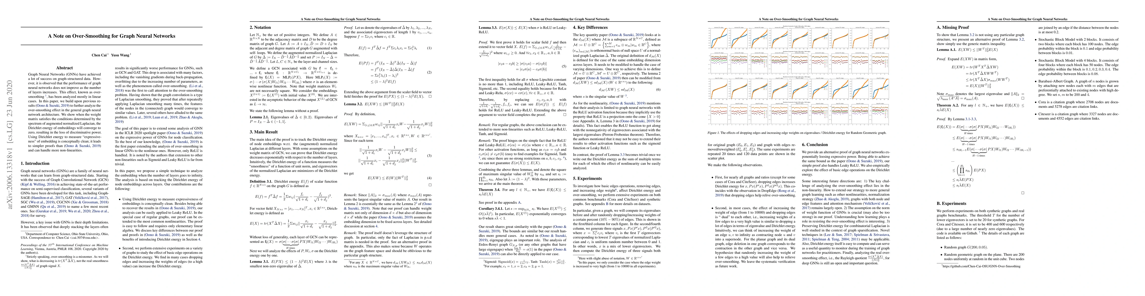 This paper investigates the over-smoothing phenomenon in Graph Neural Networks (GNNs), showing that as the number of layers increases, performance plateaus due to the convergence of Dirichlet energy to zero. It provides a more general analysis than previous works, using the spectrum of the augmented normalized Laplacian to determine conditions under which embeddings lose discriminative power.