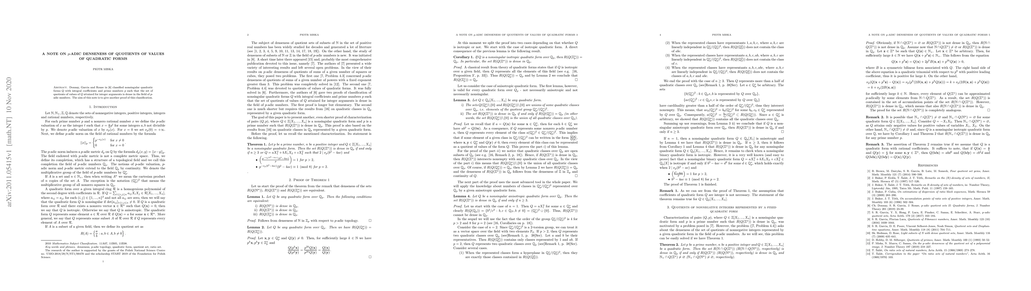 Donnay, Garcia and Rouse classified nonsingular quadratic forms $Q$ with integral coefficients and prime numbers $p$ such that the set of quotients of values of $Q$ attained for integer arguments is dense in the field of $p$-adic numbers. The aim of this note is to give another proof of this classification.