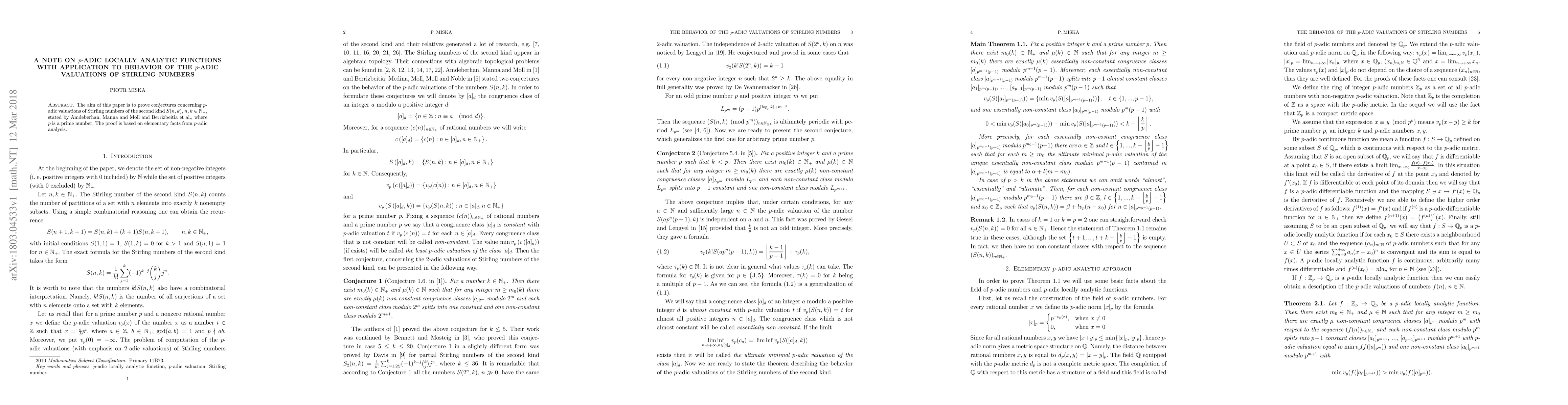 This paper proves conjectures regarding the $p$-adic valuations of Stirling numbers of the second kind using elementary $p$-adic analysis, contributing to the understanding of their behavior. The results are significant for applications in $p$-adic locally analytic functions.