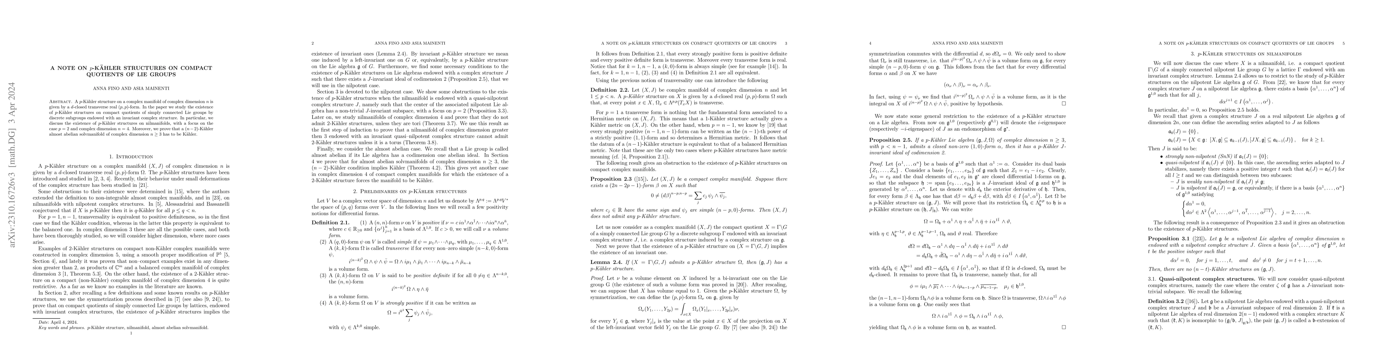 This paper investigates the existence of $p$-Kähler structures on compact quotients of simply connected Lie groups by discrete subgroups, focusing on nilmanifolds and proving that $(n-2)$-Kähler almost abelian solvmanifolds of complex dimension $n \geq 3$ are necessarily Kähler.