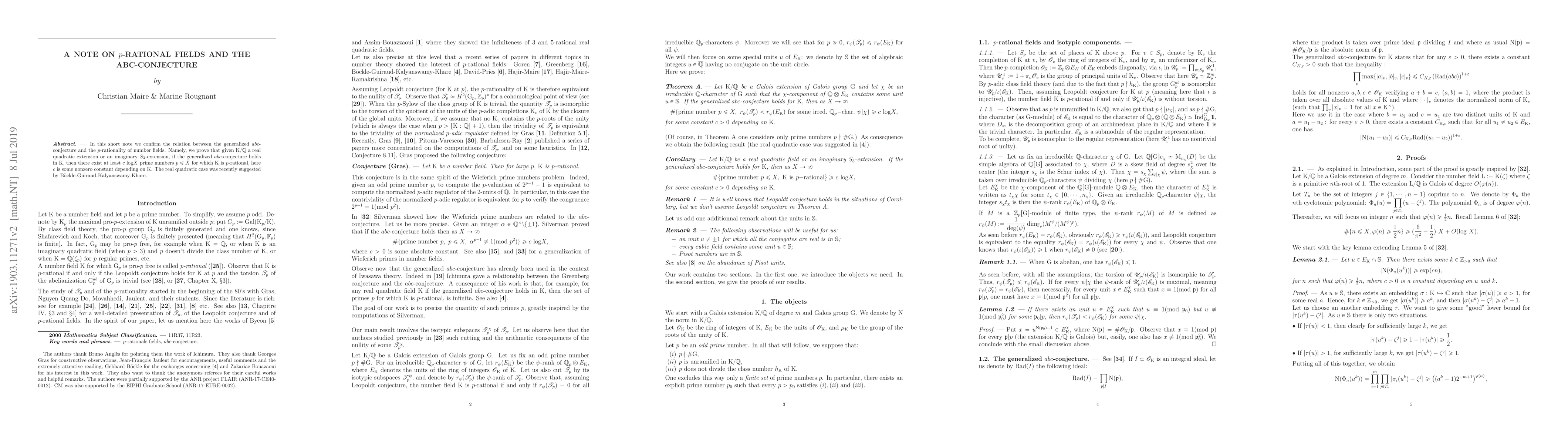 In this short note we confirm the relation between the generalized $abc$-conjecture and the $p$-rationality of number fields. Namely, we prove that given K$/\mathbb{Q}$ a real quadratic extension or an imaginary $S_3$-extension, if the generalized $abc$-conjecture holds in K, then there exist at least $c\,\log X$ prime numbers $p \leq X$ for which K is $p$-rational, here $c$ is some nonzero constant depending on K. The real quadratic case was recently suggested by B\"ockle-Guiraud-Kalyanswamy-Khare.
