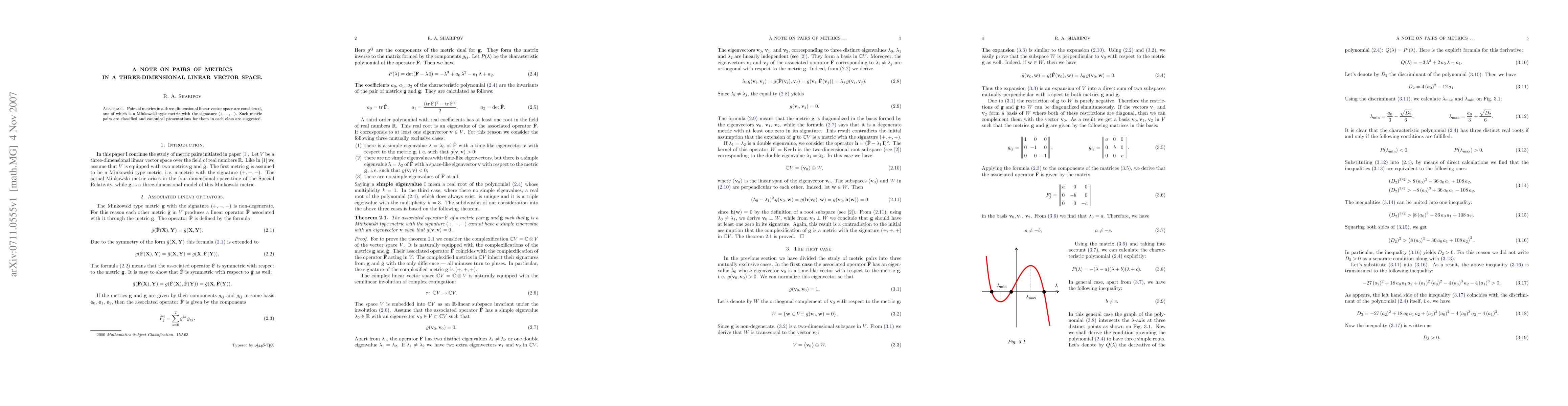Pairs of metrics in a three-dimensional linear vector space are considered, one of which is a Minkowski type metric with the signature (+,-,-). Such metric pairs are classified and canonical presentations for them in each class are suggested.