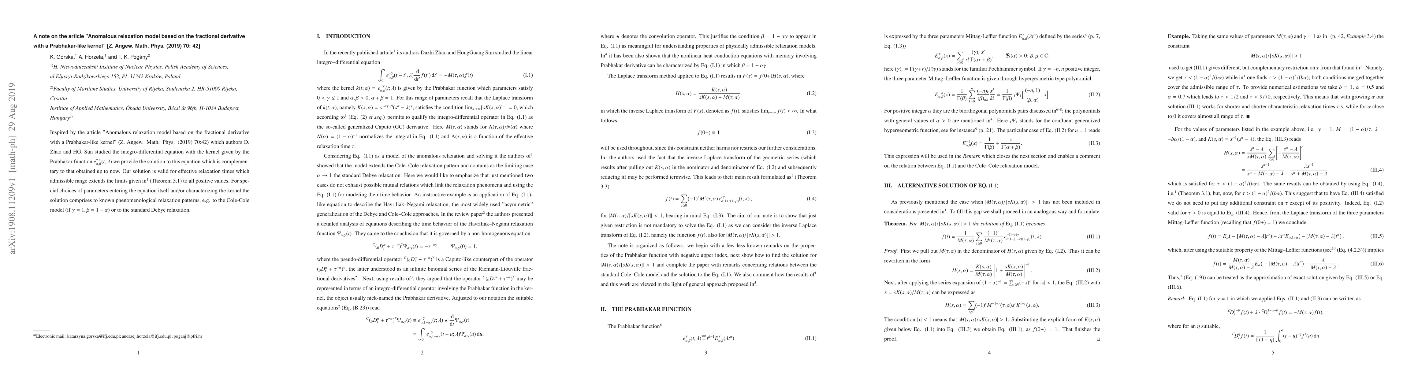 Inspired by the article "Anomalous relaxation model based on the fractional derivative with a Prabhakar-like kernel" (Z. Angew. Math. Phys. (2019) 70:42) which authors D. Zhao and HG. Sun studied the integro-differential equation with the kernel given by the Prabhakar function $e^{-\gamma}_{\alpha, \beta}(t, \lambda)$ we provide the solution to this equation which is complementary to that obtained up to now. Our solution is valid for effective relaxation times which admissible range extends the limits given in \cite[Theorem 3.1]{DZhao2019} to all positive values. For special choices of parameters entering the equation itself and/or characterizing the kernel the solution comprises to known phenomenological relaxation patterns, e.g. to the Cole-Cole model (if $\gamma = 1, \beta=1-\alpha$) or to the standard Debye relaxation.