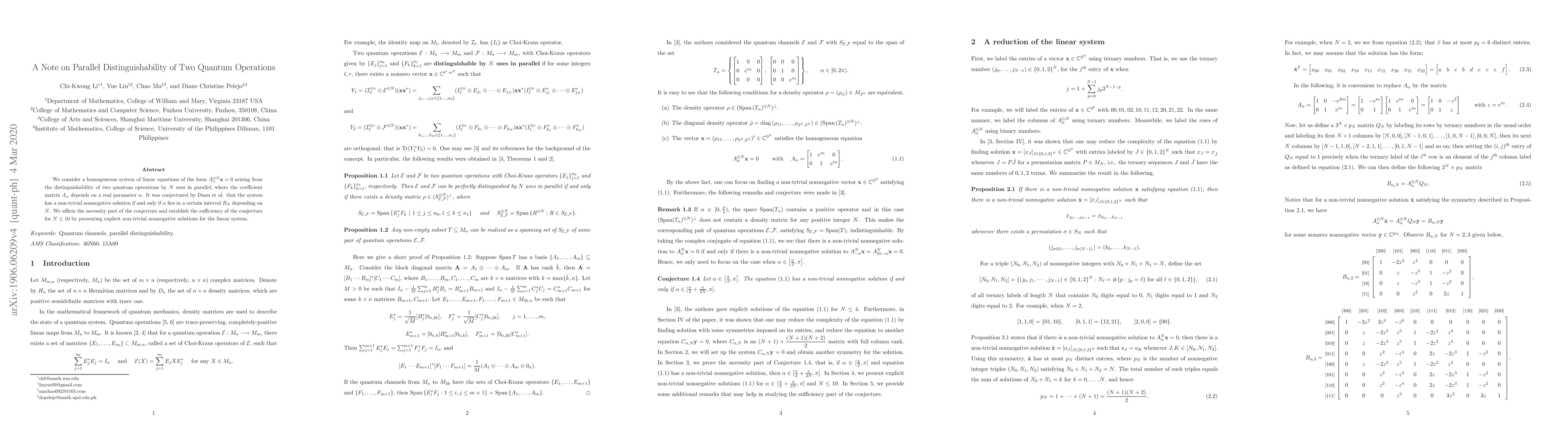 We consider a homogeneous system of linear equations of the form $A_\alpha^{\otimes N} {\bf x} = 0$ arising from the distinguishability of two quantum operations by $N$ uses in parallel, where the coefficient matrix $A_\alpha$ depends on a real parameter $\alpha$. It was conjectured by Duan et al. that the system has a non-trivial nonnegative solution if and only if $\alpha$ lies in a certain interval $R_N$ depending on $N$. We affirm the necessity part of the conjecture and establish the sufficiency of the conjecture for $N\leq 10$ by presenting explicit non-trivial nonnegative solutions for the linear system.