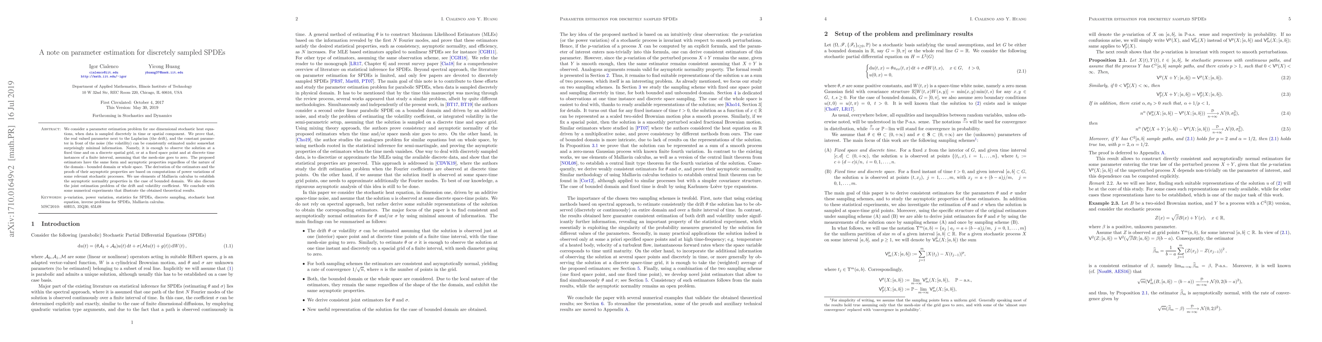 This paper presents consistent estimators for parameters in one-dimensional stochastic heat equations sampled discretely in time or space, proving that minimal data suffices for estimation. The estimators maintain the same form and asymptotic properties across different domains, with theoretical results supported by numerical experiments.