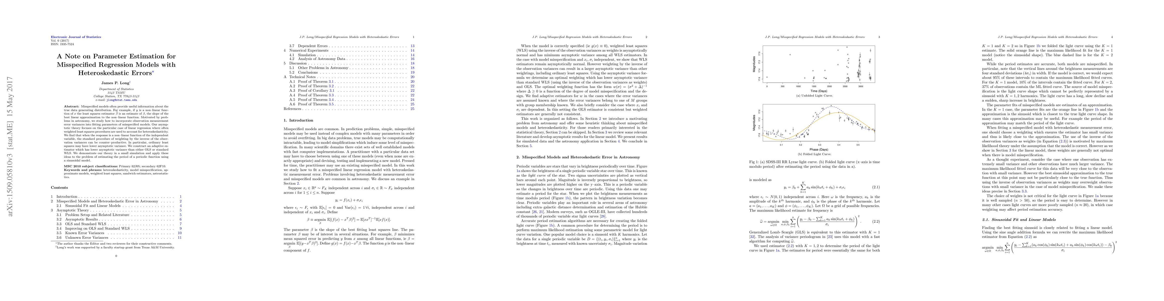 Misspecified models often provide useful information about the true data generating distribution. For example, if $y$ is a non-linear function of $x$ the least squares estimator $\hat{\beta}$ is an estimate of $\beta$, the slope of the best linear approximation to the non-linear function. Motivated by problems in astronomy, we study how to incorporate observation measurement error variances into fitting parameters of misspecified models. Our asymptotic theory focuses on the particular case of linear regression where often weighted least squares procedures are used to account for heteroskedasticity. We find that when the response is a non-linear function of the independent variable, the standard procedure of weighting by the inverse of the observation variances can be counter-productive. In particular, ordinary least squares may have lower asymptotic variance. We construct an adaptive estimator which has lower asymptotic variance than either OLS or standard WLS. We demonstrate our theory in a small simulation and apply these ideas to the problem of estimating the period of a periodic function using a sinusoidal model.
