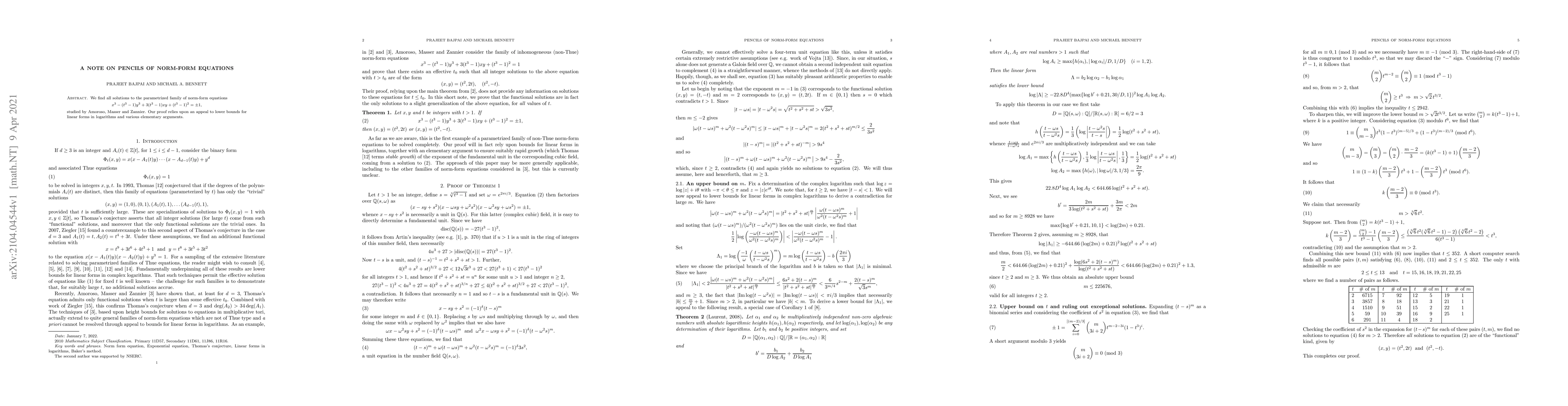 We find all solutions to the parametrized family of norm-form equations $x^3-(t^3-1)y^3+3(t^3-1)xy+(t^3-1)^2 = \pm 1$ studied by Amoroso, Masser and Zannier. Our proof relies upon an appeal to lower bounds for linear forms in logarithms and various elementary arguments.