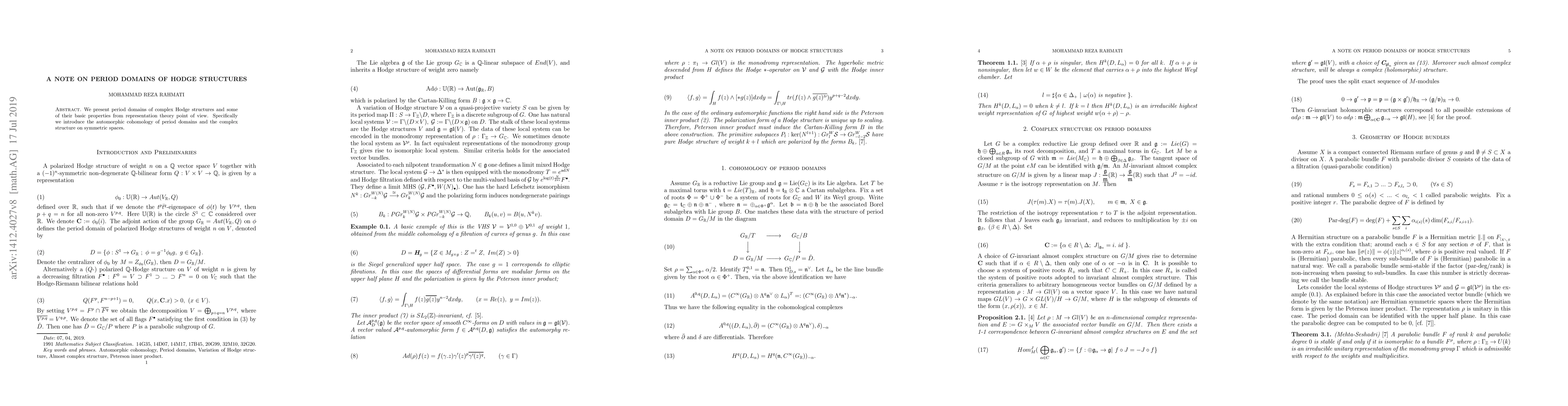 This paper explores the period domains of complex Hodge structures, focusing on their representation-theoretic properties. It introduces the automorphic cohomology of these period domains and discusses the complex structure on symmetric spaces.
