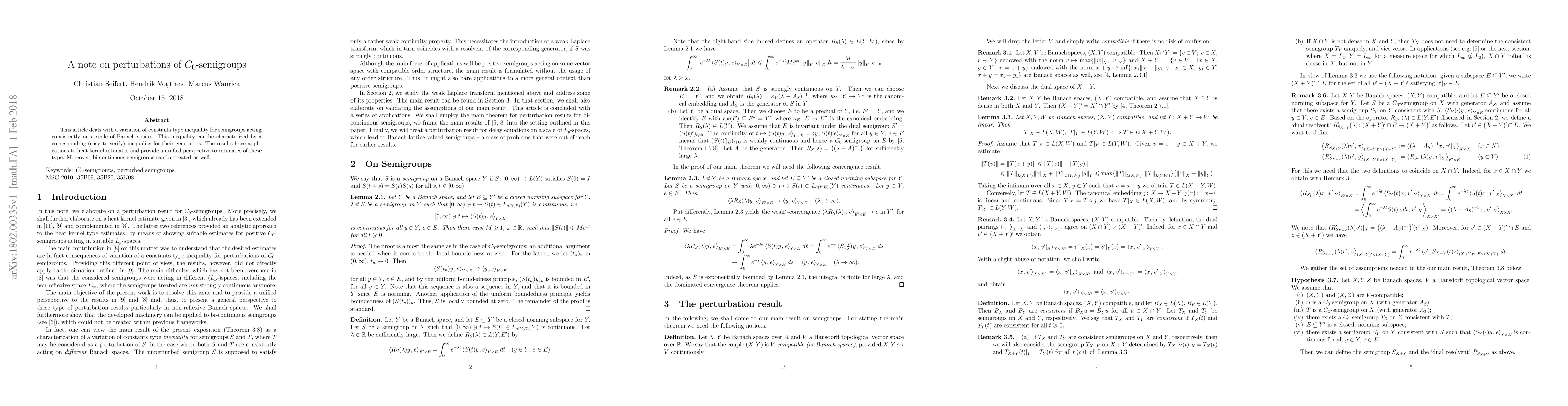 This article deals with a variation of constants type inequality for semigroups acting consistently on a scale of Banach spaces. This inequality can be characterized by a corresponding (easy to verify) inequality for their generators. The results have applications to heat kernel estimates and provide a unified perspective to estimates of these type. Moreover, bi-continuous semigroups can be treated as well.