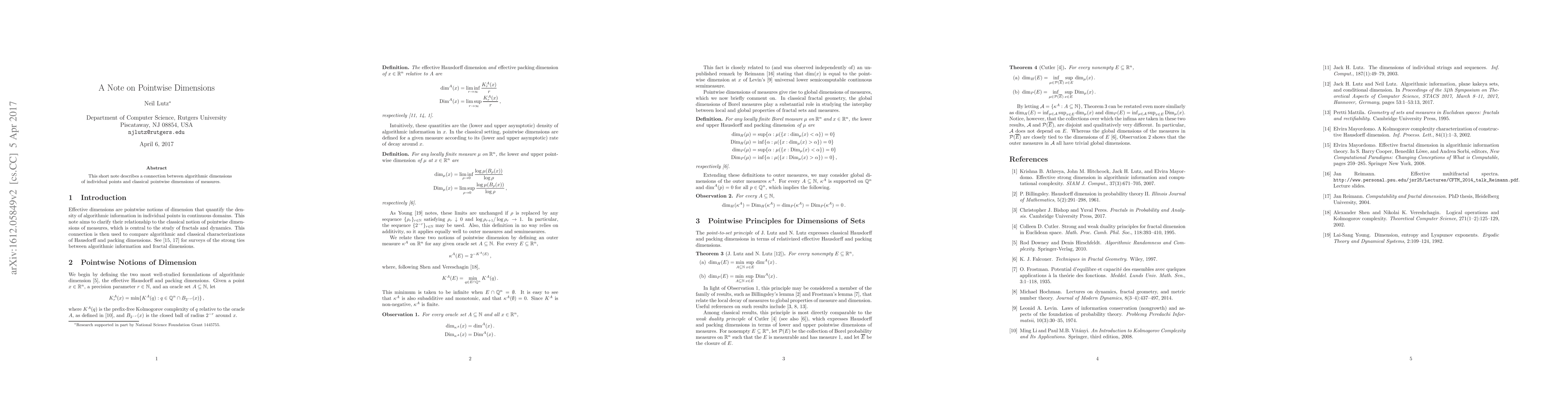 This short note describes a connection between algorithmic dimensions of individual points and classical pointwise dimensions of measures.