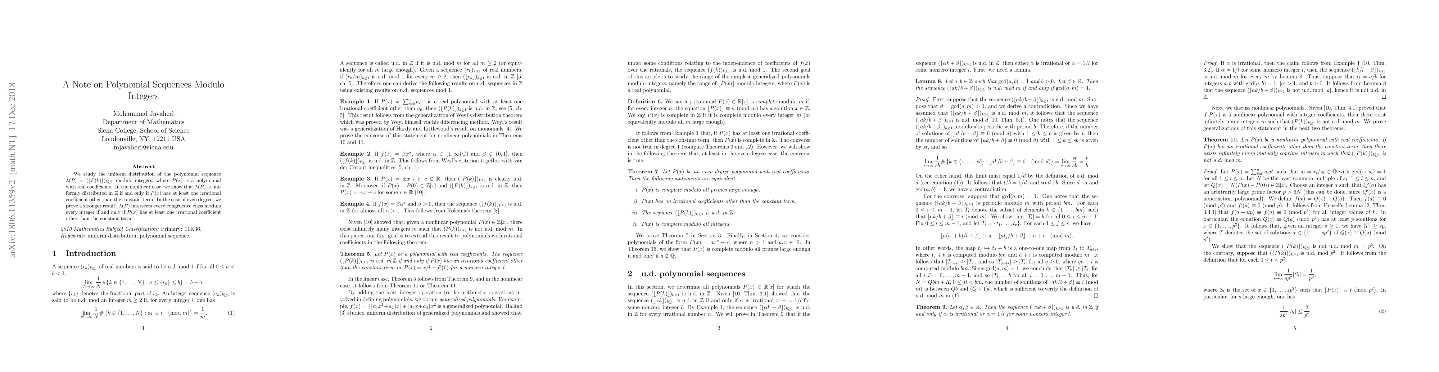 We study the uniform distribution of the polynomial sequence $\lambda(P)=(\lfloor P(k) \rfloor )_{k\geq 1}$ modulo integers, where $P(x)$ is a polynomial with real coefficients. In the nonlinear case, we show that $\lambda(P)$ is uniformly distributed in $\mathbb{Z}$ if and only if $P(x)$ has at least one irrational coefficient other than the constant term. In the case of even degree, we prove a stronger result: $\lambda(P)$ intersects every congruence class modulo every integer if and only if $P(x)$ has at least one irrational coefficient other than the constant term.