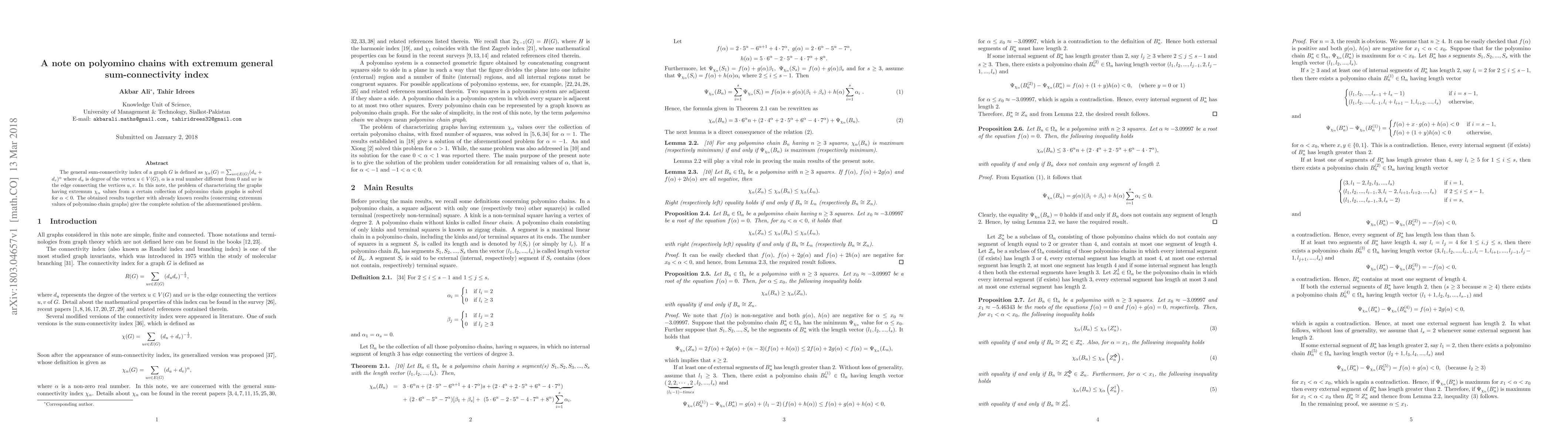 The general sum-connectivity index of a graph $G$ is defined as $\chi_{\alpha}(G)= \sum_{uv\in E(G)} (d_u + d_{v})^{\alpha}$ where $d_{u}$ is degree of the vertex $u\in V(G)$, $\alpha$ is a real number different from $0$ and $uv$ is the edge connecting the vertices $u,v$. In this note, the problem of characterizing the graphs having extremum $\chi_{\alpha}$ values from a certain collection of polyomino chain graphs is solved for $\alpha<0$. The obtained results together with already known results (concerning extremum values of polyomino chain graphs) give the complete solution of the aforementioned problem.