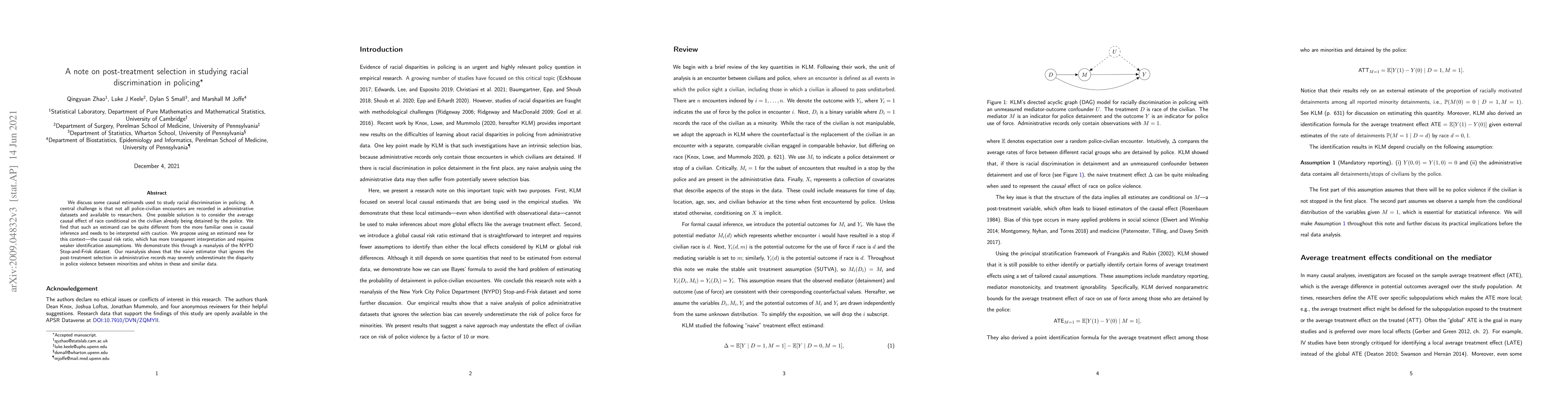 This paper examines the challenge of studying racial discrimination in policing, particularly when not all police-civilian encounters are recorded. It proposes the causal risk ratio as a more interpretable and less assumption-heavy alternative to traditional causal estimands, demonstrating its effectiveness through a reanalysis of the NYPD Stop-and-Frisk dataset, which reveals significant underestimation of racial disparities when ignoring post-treatment selection.