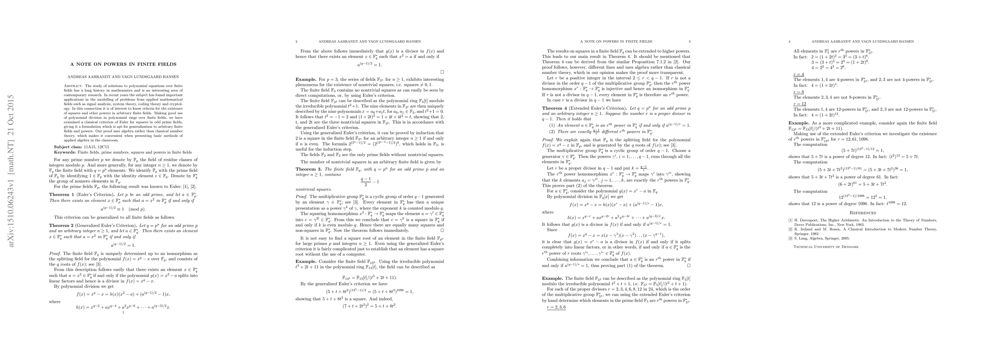 The study of solutions to polynomial equations over finite fields has a long history in mathematics and is an interesting area of contemporary research. In recent years the subject has found important applications in the modelling of problems from applied mathematical fields such as signal analysis, system theory, coding theory and cryptology. In this connection it is of interest to know criteria for the existence of squares and other powers in arbitrary finite fields. Making good use of polynomial division in polynomial rings over finite fields, we have examined a classical criterion of Euler for squares in odd prime fields, giving it a formulation which is apt for generalization to arbitrary finite fields and powers. Our proof uses algebra rather than classical number theory, which makes it convenient when presenting basic methods of applied algebra in the classroom.