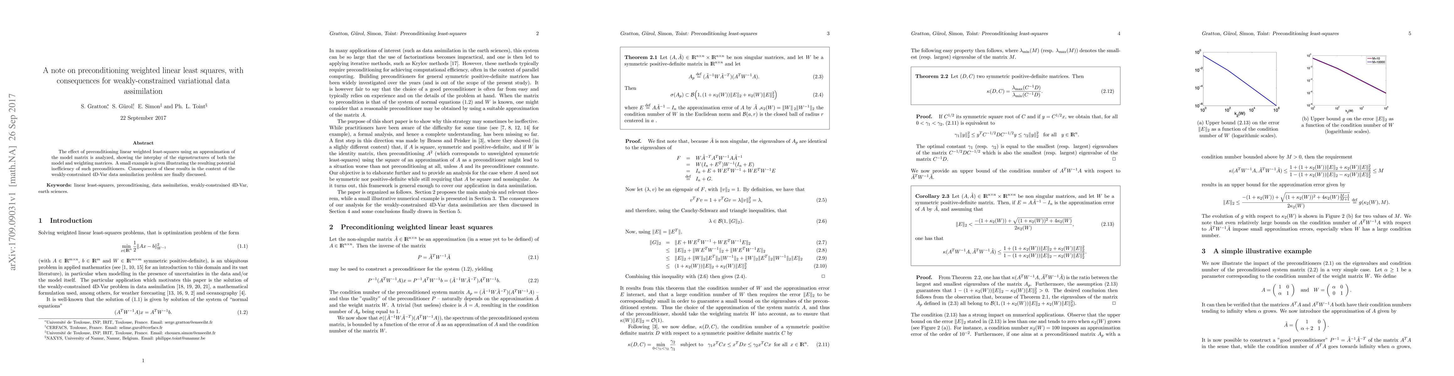 The effect of preconditioning linear weighted least-squares using an approximation of the model matrix is analyzed, showing the interplay of the eigenstructures of both the model and weighting matrices. A small example is given illustrating the resulting potential inefficiency of such preconditioners. Consequences of these results in the context of the weakly-constrained 4D-Var data assimilation problem are finally discussed.