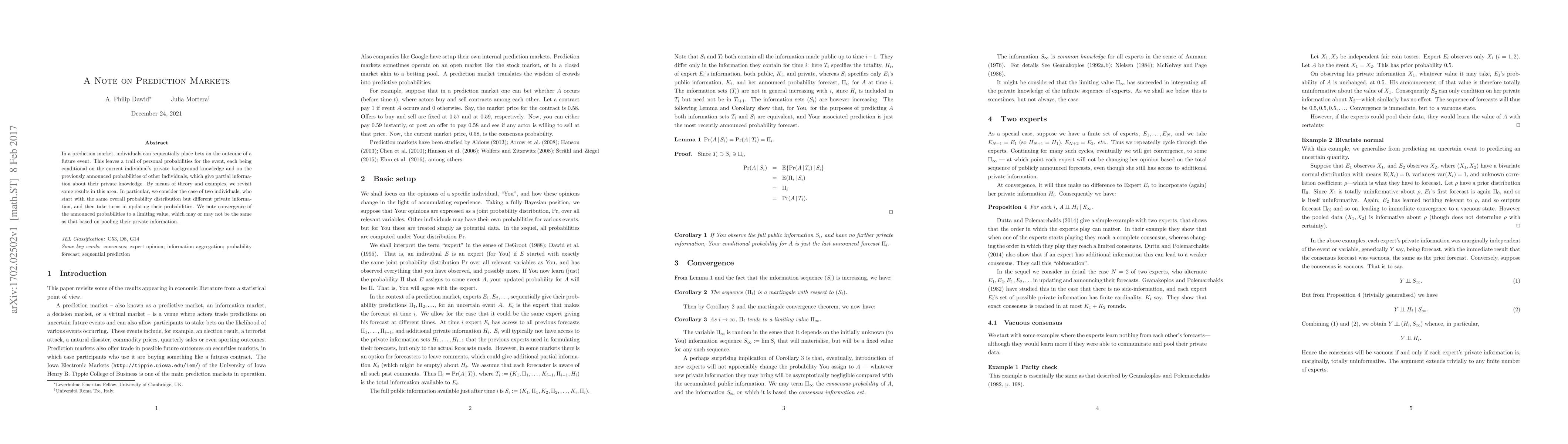 In a prediction market, individuals can sequentially place bets on the outcome of a future event. This leaves a trail of personal probabilities for the event, each being conditional on the current individual's private background knowledge and on the previously announced probabilities of other individuals, which give partial information about their private knowledge. By means of theory and examples, we revisit some results in this area. In particular, we consider the case of two individuals, who start with the same overall probability distribution but different private information, and then take turns in updating their probabilities. We note convergence of the announced probabilities to a limiting value, which may or may not be the same as that based on pooling their private information.