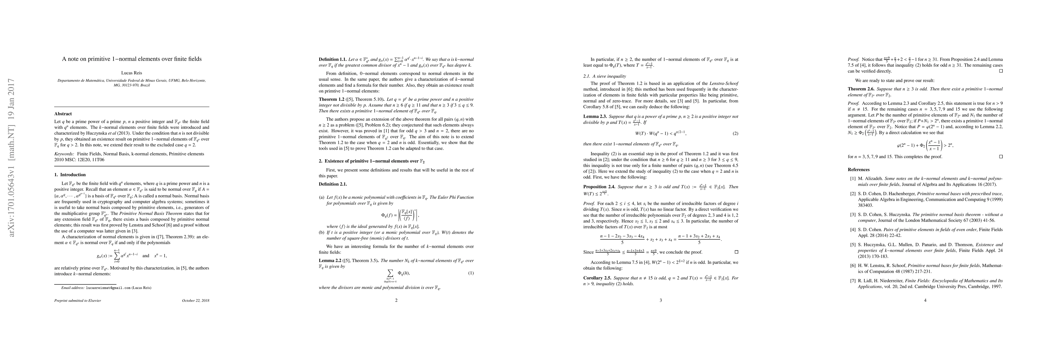 Let $q$ be a prime power of a prime $p$, $n$ a positive integer and $\mathbb F_{q^n}$ the finite field with $q^n$ elements. The $k-$normal elements over finite fields were introduced and characterized by Huczynska et al (2013). Under the condition that $n$ is not divisible by $p$, they obtained an existence result on primitive $1-$normal elements of $\mathbb F_{q^n}$ over $\mathbb F_q$ for $q>2$. In this note, we extend their result to the excluded case $q=2$.
