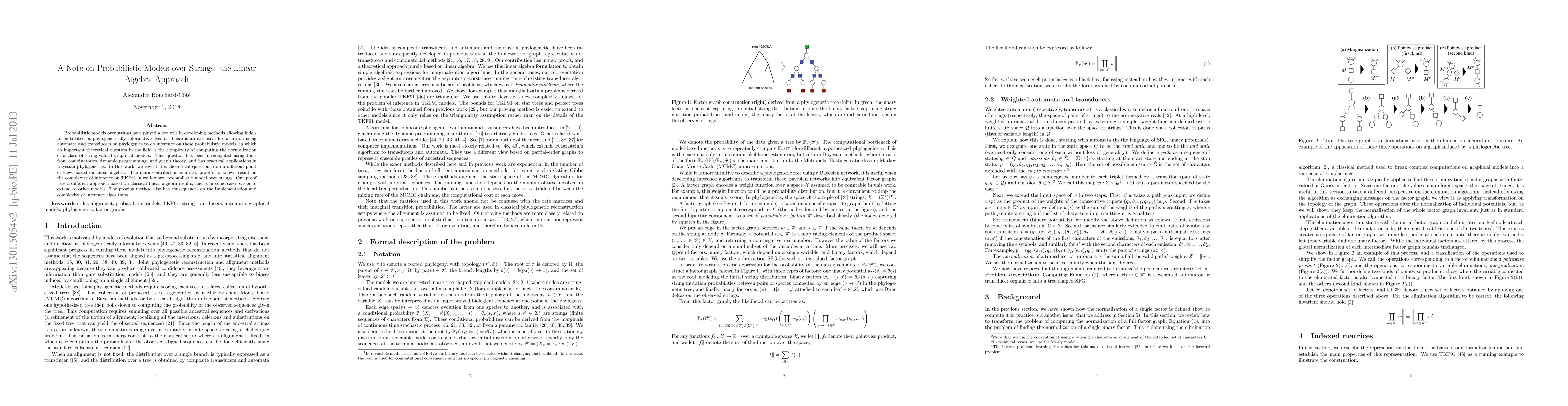 Probabilistic models over strings have played a key role in developing methods allowing indels to be treated as phylogenetically informative events. There is an extensive literature on using automata and transducers on phylogenies to do inference on these probabilistic models, in which an important theoretical question in the field is the complexity of computing the normalization of a class of string-valued graphical models. This question has been investigated using tools from combinatorics, dynamic programming, and graph theory, and has practical applications in Bayesian phylogenetics. In this work, we revisit this theoretical question from a different point of view, based on linear algebra. The main contribution is a new proof of a known result on the complexity of inference on TKF91, a well-known probabilistic model over strings. Our proof uses a different approach based on classical linear algebra results, and is in some cases easier to extend to other models. The proving method also has consequences on the implementation and complexity of inference algorithms.