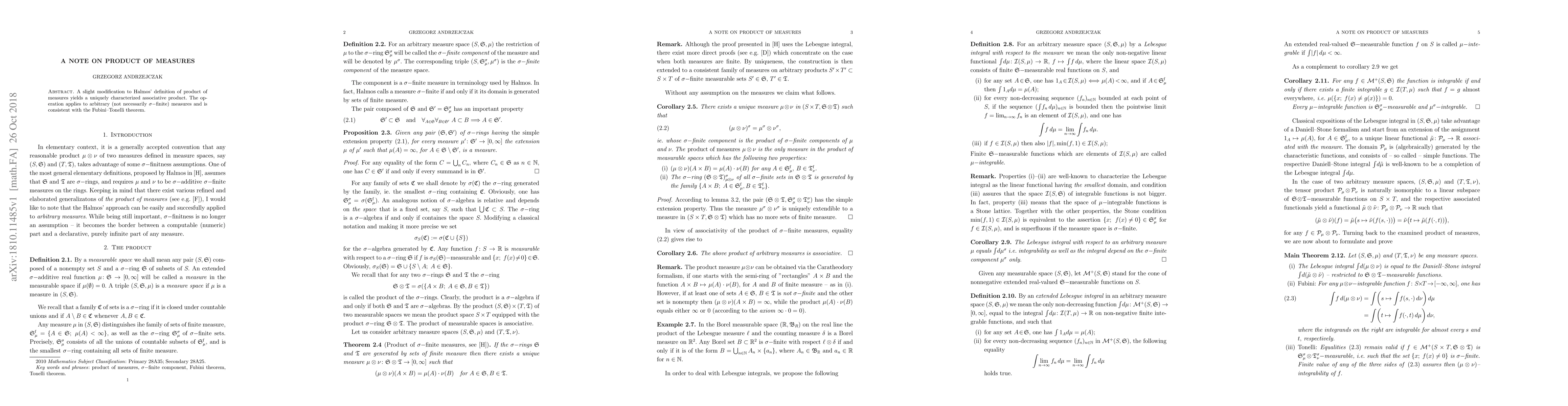 A slight modification to Halmos' definition of product of measures yields a uniquely characterized associative product. The operation applies to arbitrary (not necessarily $\sigma-$finite) measures and is consistent with the Fubini--Tonelli theorem.