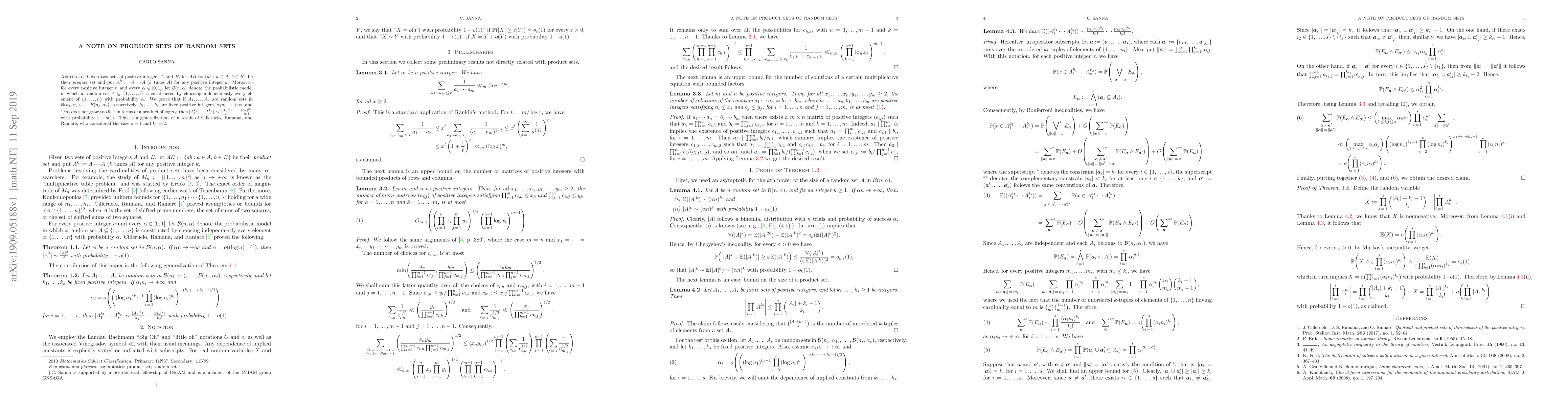 Given two sets of positive integers $A$ and $B$, let $AB := \{ab : a \in A,\, b \in B\}$ be their product set and put $A^k := A \cdots A$ ($k$ times $A$) for any positive integer $k$. Moreover, for every positive integer $n$ and every $\alpha \in [0,1]$, let $\mathcal{B}(n, \alpha)$ denote the probabilistic model in which a random set $A \subseteq \{1, \dots, n\}$ is constructed by choosing independently every element of $\{1, \dots, n\}$ with probability $\alpha$. We prove that if $A_1, \dots, A_s$ are random sets in $\mathcal{B}(n_1, \alpha_1), \dots, \mathcal{B}(n_s, \alpha_s)$, respectively, $k_1, \dots, k_s$ are fixed positive integers, $\alpha_i n_i \to +\infty$, and $1/\alpha_i$ does not grow too fast in terms of a product of $\log n_j$; then $|A_1^{k_1} \cdots A_s^{k_s}| \sim \frac{|A_1|^{k_1}}{k_1!}\cdots\frac{|A_s|^{k_s}}{k_s!}$ with probability $1 - o(1)$. This is a generalization of a result of Cilleruelo, Ramana, and Ramar\'e, who considered the case $s = 1$ and $k_1 = 2$.