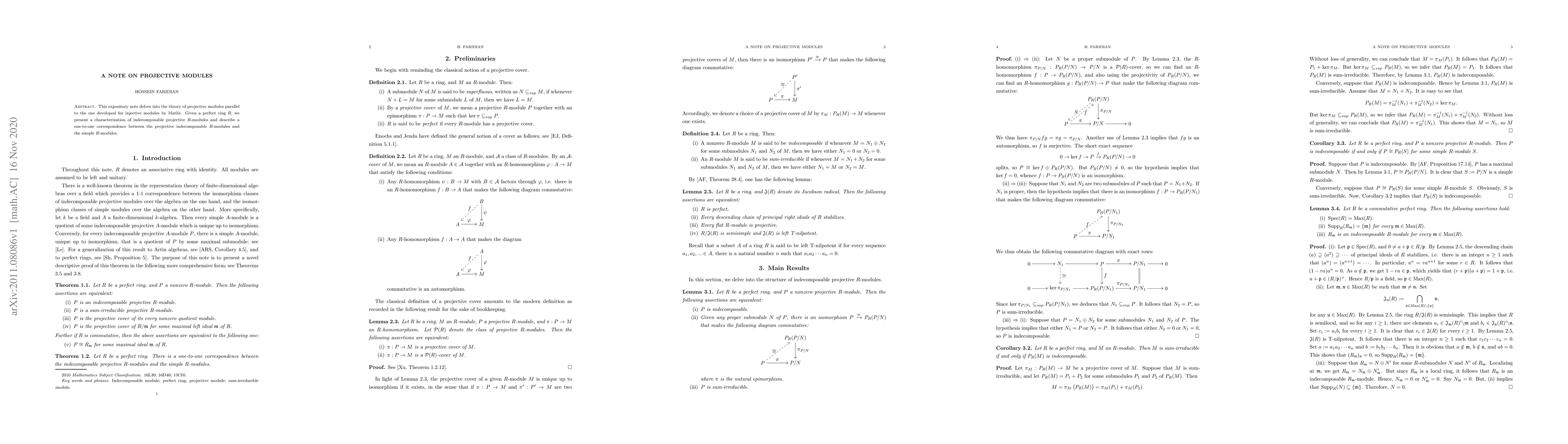 This note explores the theory of projective modules in the context of perfect rings, providing a characterization of indecomposable projective modules and establishing a one-to-one correspondence between these modules and simple $R$-modules.
