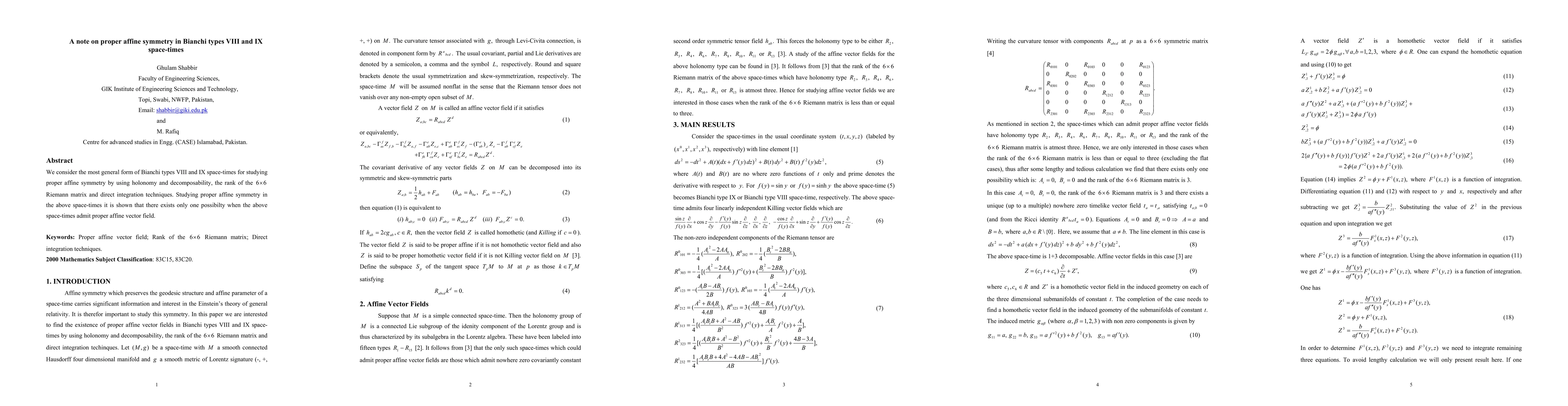 This paper investigates the proper affine symmetry in Bianchi types VIII and IX space-times using holonomy, decomposability, and Riemann matrix analysis. It concludes that only one possibility exists for the existence of a proper affine vector field in these space-times.