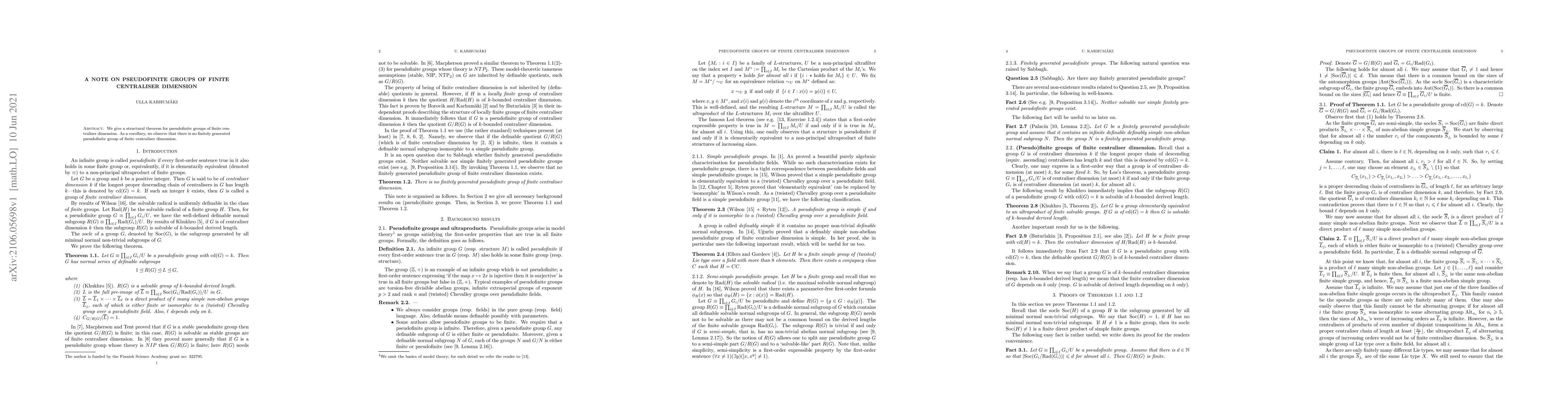 Title: Structural Theorem for Pseudofinite Groups with Finite Centraliser Dimension Summary: The paper presents a structural theorem for pseudofinite groups with finite centraliser dimension, concluding that no finitely generated pseudofinite group can have this property.