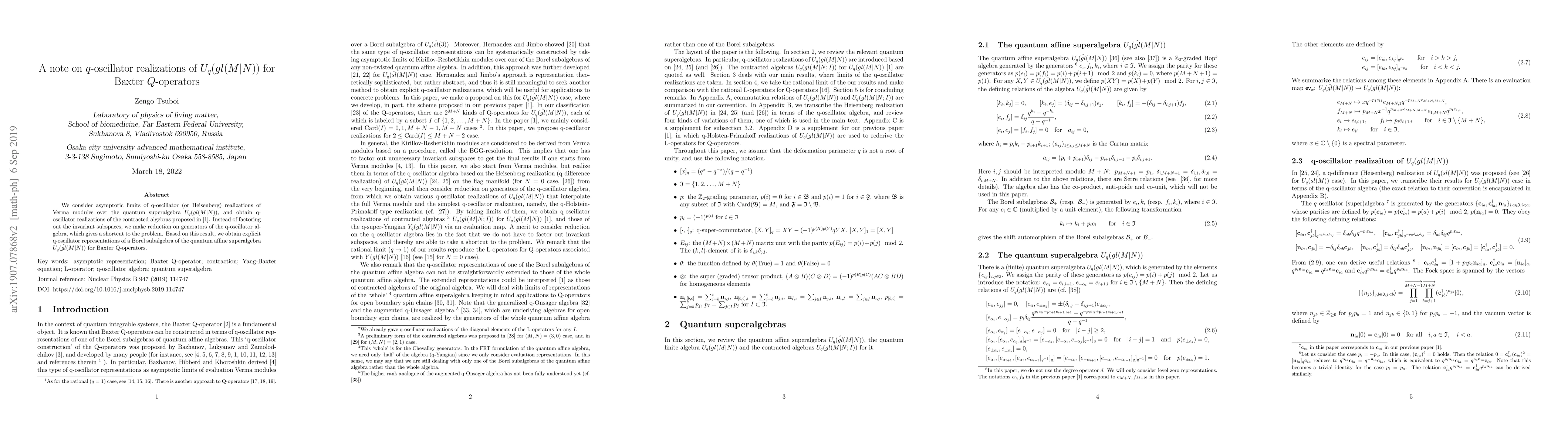 This paper explores asymptotic limits of q-oscillator realizations for Verma modules in the quantum superalgebra $U_{q}(gl(M|N))$, achieving q-oscillator representations of contracted algebras. It provides a shortcut by reducing q-oscillator algebra generators instead of factoring invariant subspaces, leading to explicit representations of a Borel subalgebra for Baxter Q-operators.