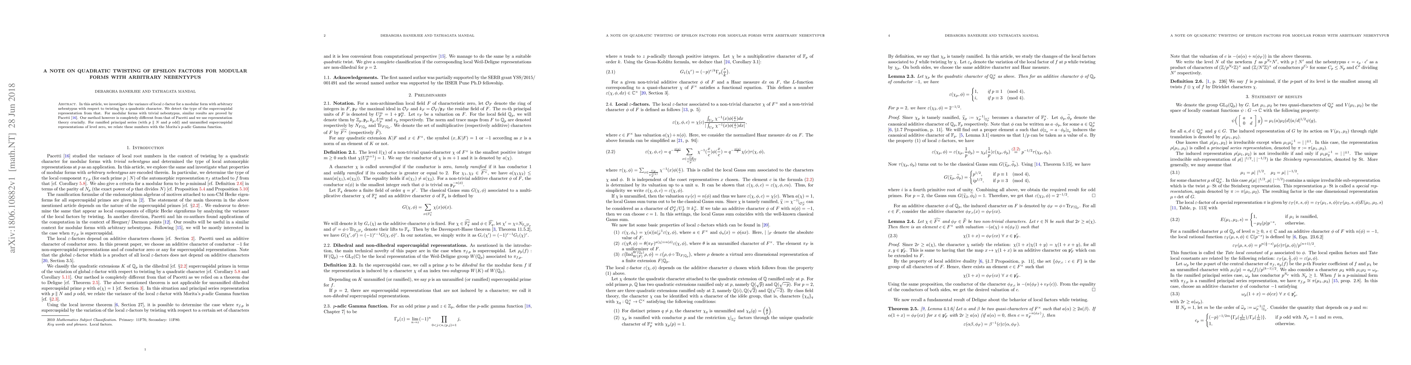 In this article, we investigate the variance of local $\varepsilon$-factor for a modular form with arbitrary nebentypus with respect to twisting by a quadratic character. We detect the type of the supercuspidal representation from that. For modular forms with trivial nebentypus, similar results are proved by Pacetti. Our method however is completely different from that of Pacetti and we use representation theory crucially. For ramified principal series (with $\infdiv{p}{N}$ and $p$ odd) and unramified supercuspidal representations of level zero, we relate these numbers with the Morita's $p$-adic Gamma function.